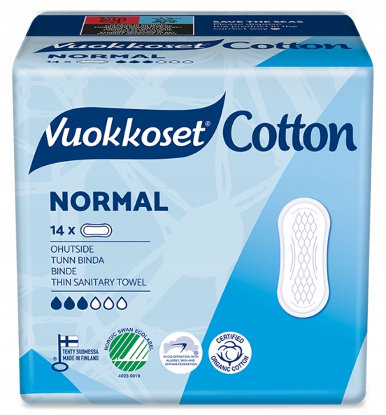 Натуральне ядро походить безпосередньо з целюлози з фінських лісів. 4. Тильний шар забезпечує надійний захист від протікань. В упаковці: 12 штук гігієнічних прокладок довжиною 225 мм і товщиною 1,5 мм Сертифікати: - Allergy and Asthma Federation - Nordic Ecolabel 4023 0019 3 за шестиступінчастою шкалою поглинання. Вкладиші та гігієнічні прокладки піддаються компостуванню та біологічному розкладанню відповідно до стандартів директиви EN 13432. Упаковка біологічно розкладається та виготовлена із зеленого поліетилену (матеріал походить із цукрової тростини). Vuokkoset — фінський бренд. зосереджуючись на виробництві гігієнічних аксесуарів найвищої якості. Усі продукти сертифіковані Nordic Ecolabel.