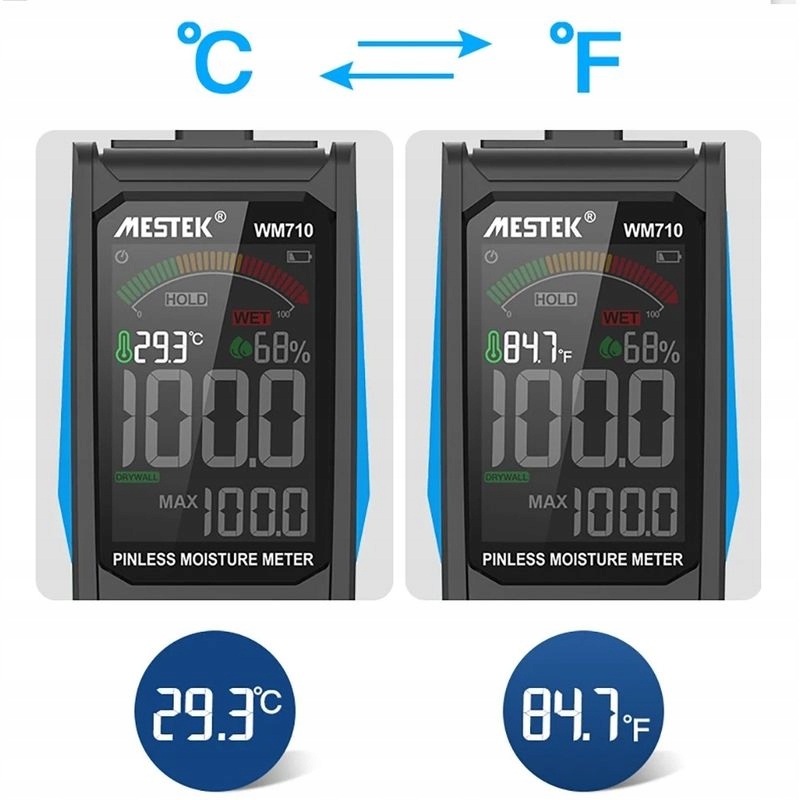 Неруйнівний індукційний гігрометр, підходить для твердих і м’яких дерево, цегляна кладка та гіпсокартон, барвистий і чіткий дисплей, Вимірювання °C і °F, живлення від 3 батарейок AAA.