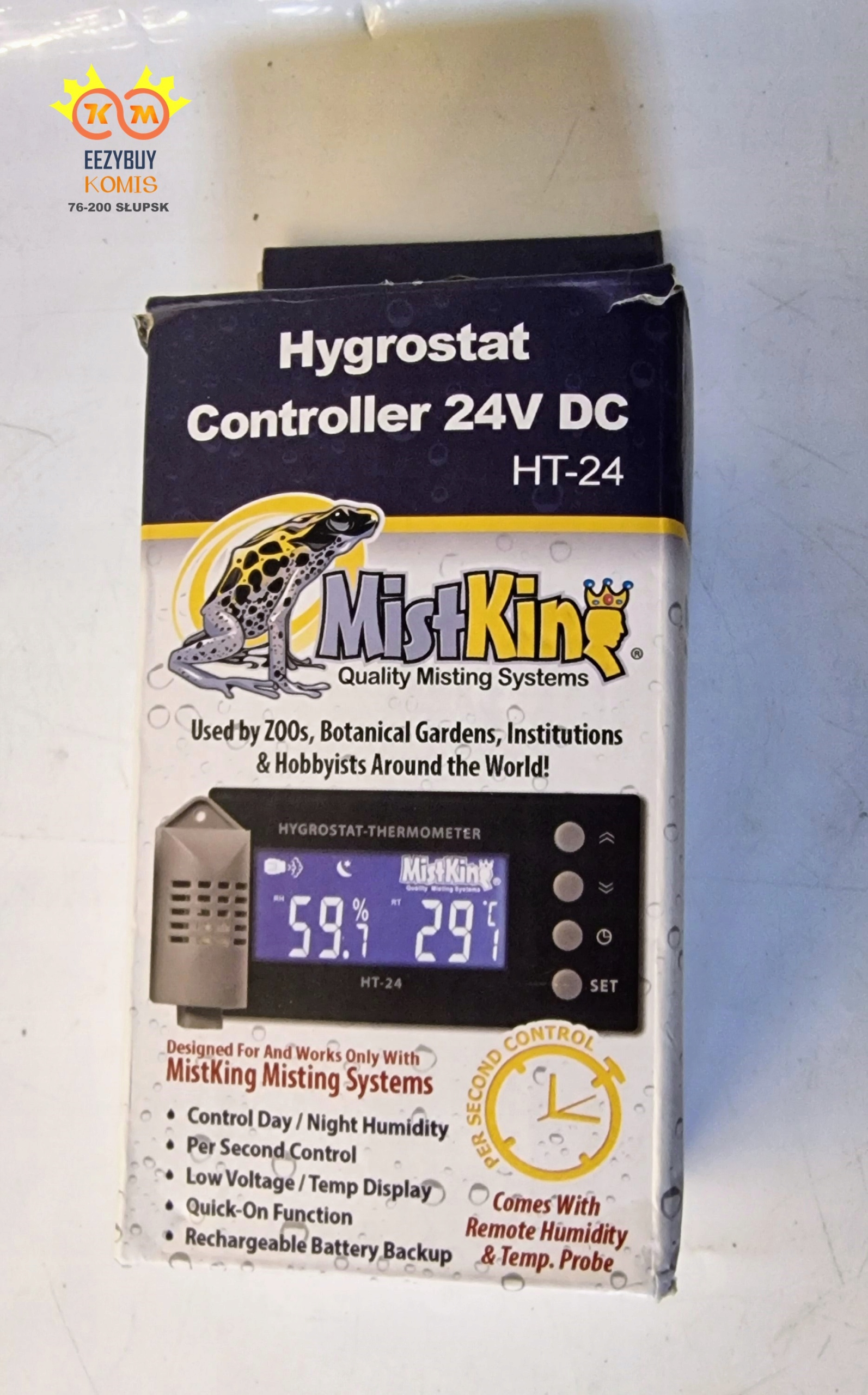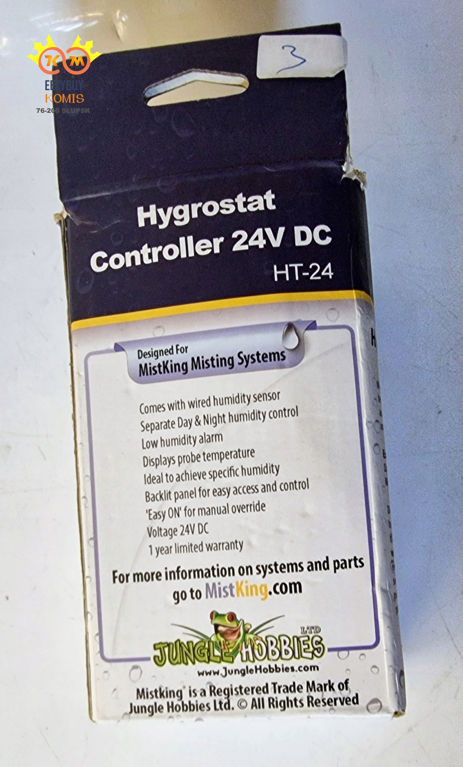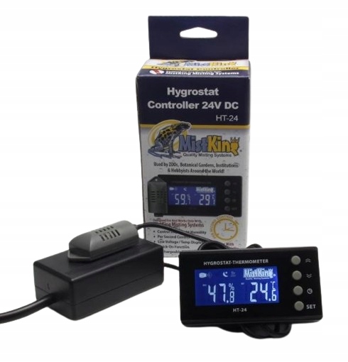 Гігростат HT-24 був розроблений спеціально для використання з системами туману MistKing, він включає РК-панель з підсвічуванням і дозволяє підтримувати вологість на належному заданому рівні. Він працює шляхом постійного моніторингу вологості завдяки тому, що він оснащений зондом. На основі поточних показань і бажаної вологості HT-24 за потреби активує систему туману. Гігростат дає нам можливість визначати, коли має початися денний і нічний режими, можливість точно встановити денну та нічну вологість, а також встановити відхилення, яке враховує певне падіння вологості перед увімкненням насоса. Додатково є можливість включити систему вручну, не змінюючи встановлені налаштування. Гігростат має батарею, яка зберігає налаштування у разі відключення електроенергії та сигналізацію, яка сповістить нас про низьку вологість. Легко встановлюється, підключається до існуючого джерела живлення MistKing.
