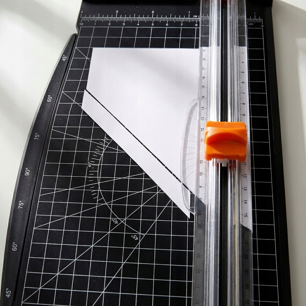 Стільниця оснащена детальною вимірювальною сіткою в дюймах і сантиметрах, що дозволяє ідеально налаштувати формат без необхідності використання додаткової лінійки. Крім того, вбудований транспортир дозволяє точно розрізати папір під кутом від 45 до 90 градусів, що є безцінним при створенні декорацій або віньєток.