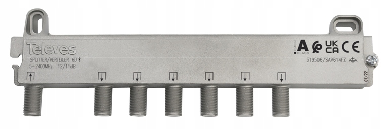 Високий -Клас Гілка 1/6 ТЕЛЕВ ref. 519506, або 1 вхід, 6 виходів , працює в діапазоні 5 МГц - 2400 МГц . Це дозволяє розділити "DVB-T2 наземний телевізійний сигнал або кабель DVB-C для шести телевізорів . Він працює з одноічною системою в супутникових установках, заснованих на цьому типі перетворювача та , дозволяє поділити Unicable Signal до шість характеристик p> icit icticiled