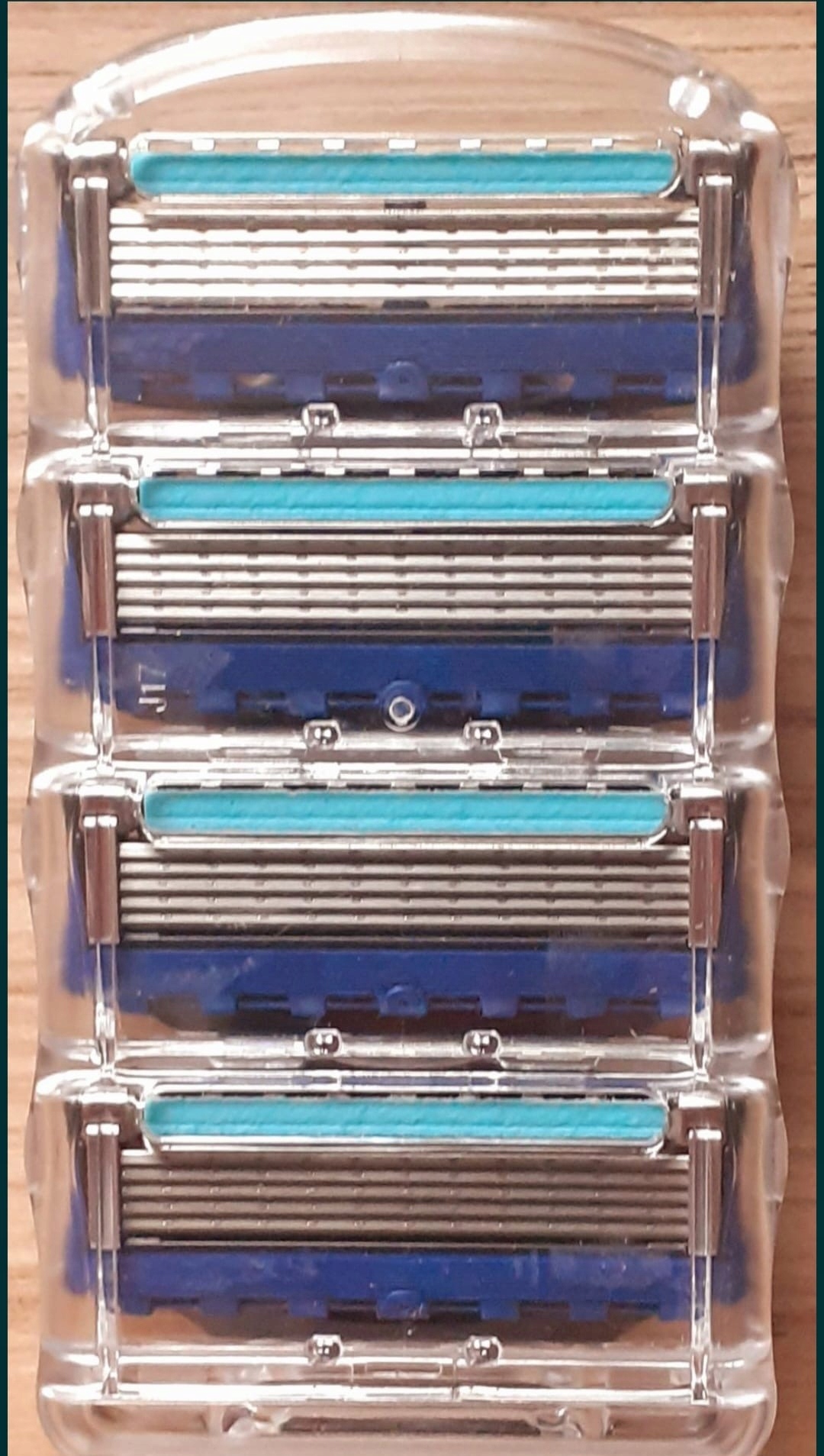 Картридж Gillette Fusion містить п'ять лез диски для голіннярозташовані ближче один до одного, щоб зменшити тиск, зменшити подразнення шкіри та підвищити комфорт і ефективність гоління. Про зношеність лез свідчить смужка, яка поступово втрачає свій колір.