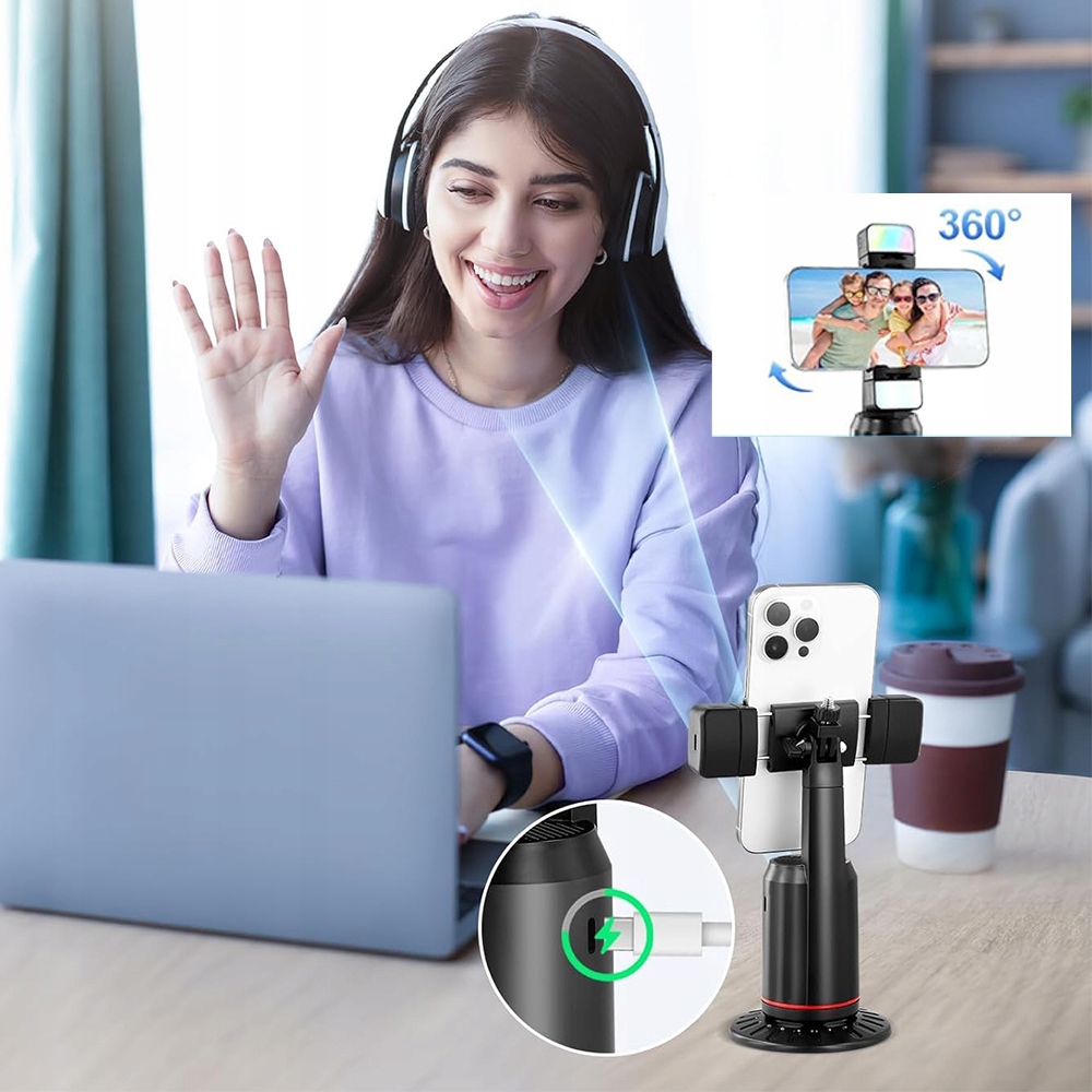 - Цей тримач телефону для відстеження обличчя використовує комп’ютерну систему в режимі реального часу для автоматичного розпізнавати та відстежувати обличчя або тіло користувача та стабільно обертатися на 360°, коли він рухає руками - ідеально підходить для відеодзвінків та прямих трансляцій.