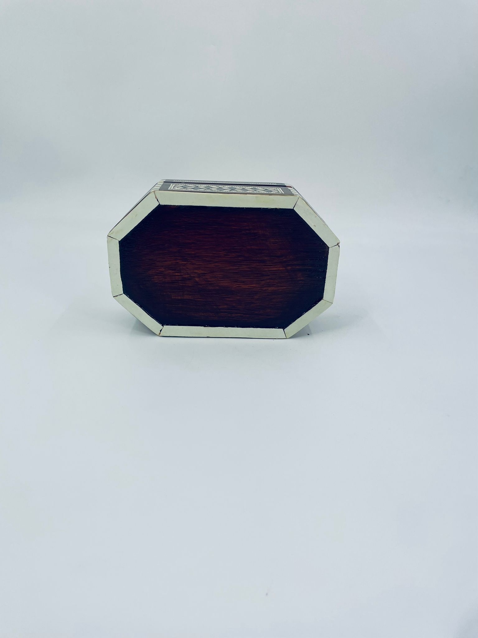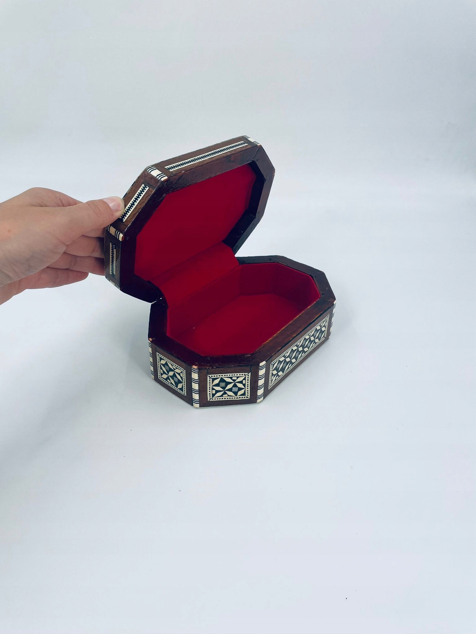Старинна єгипетська скринька для коштовностей, виготовлена з різних порід дерева, інкрустована перламутром. Для нього характерний арабесковий малюнок. Внутрішня частина коробки обшита чарівним оксамитом.