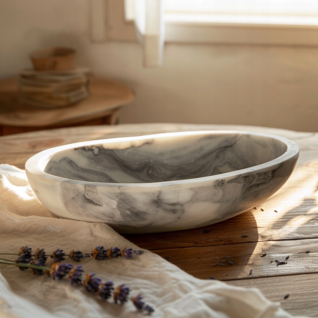 Тонкий, злегка атласний блиск підкреслює ніжну текстуру мармуру та робить форму елегантною, але зберігає легкість, характерну для штукатурки.