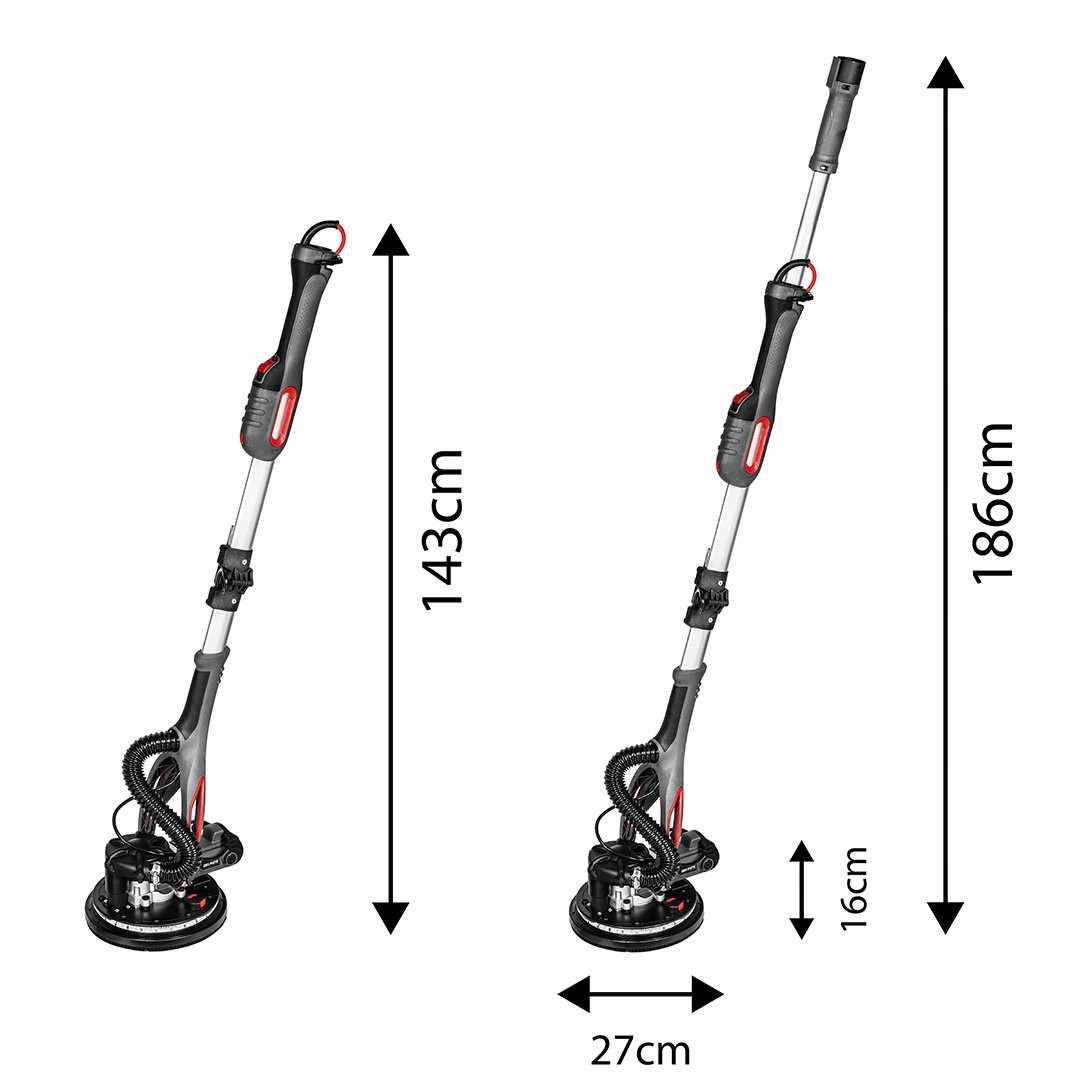 Гіпсова шліфувальна машина 800 Вт, 225 мм/215 мм, LED 59G265 від GRAPHITE Це шліфувальна машина потужністю 800 Вт зі світлодіодним підсвічуванням і телескопічною ручкою, призначена для обробки штукатурних поверхонь. Характеризується можливістю плавного регулювання поворотної головки в діапазоні від 800 до 1800 оборотів в хвилину. Діаметр шліфувального диска 215 мм. Довгий 5-метровий кабель і гнучкий всмоктуючий шланг дозволяють працювати в більш широкому діапазоні. У свою чергу, система відведення пилу дозволяє підключити пилосос і підтримувати все в порядку. Заміна використаного наждачного паперу проста завдяки застібці на липучці. Подрібнювач пропонується з наждачним папером, всмоктуючим шлангом, мішком і мішком для пилу. Гумова захисна накладка на місці ручки і додатковий робочий диск, покритий чохлом, забезпечують безпечне використання інструменту. Відповідність європейським стандартам забезпечується сертифікатом CE.