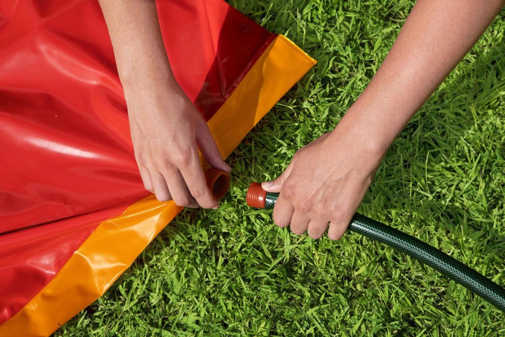 Двомісна гірка забезпечить класичні, позачасові розваги у дворах для всіх дітей старше 3 років. Це буде ідеальний спосіб провести вільний час та цікаво розважитися. Просто розгорніть гірку, прикріпіть її до землі та підключіть садовий шланг. Завдяки спеціальним захистам, що входять в комплект, гірка не зрушується. Чотири колеса, що входять до комплекту, подарують дітям додаткові розваги та змагання. У перегонах виграє той, хто першим прийде до фінішу та встигне кинути всі кружечки на відповідну підставку.
