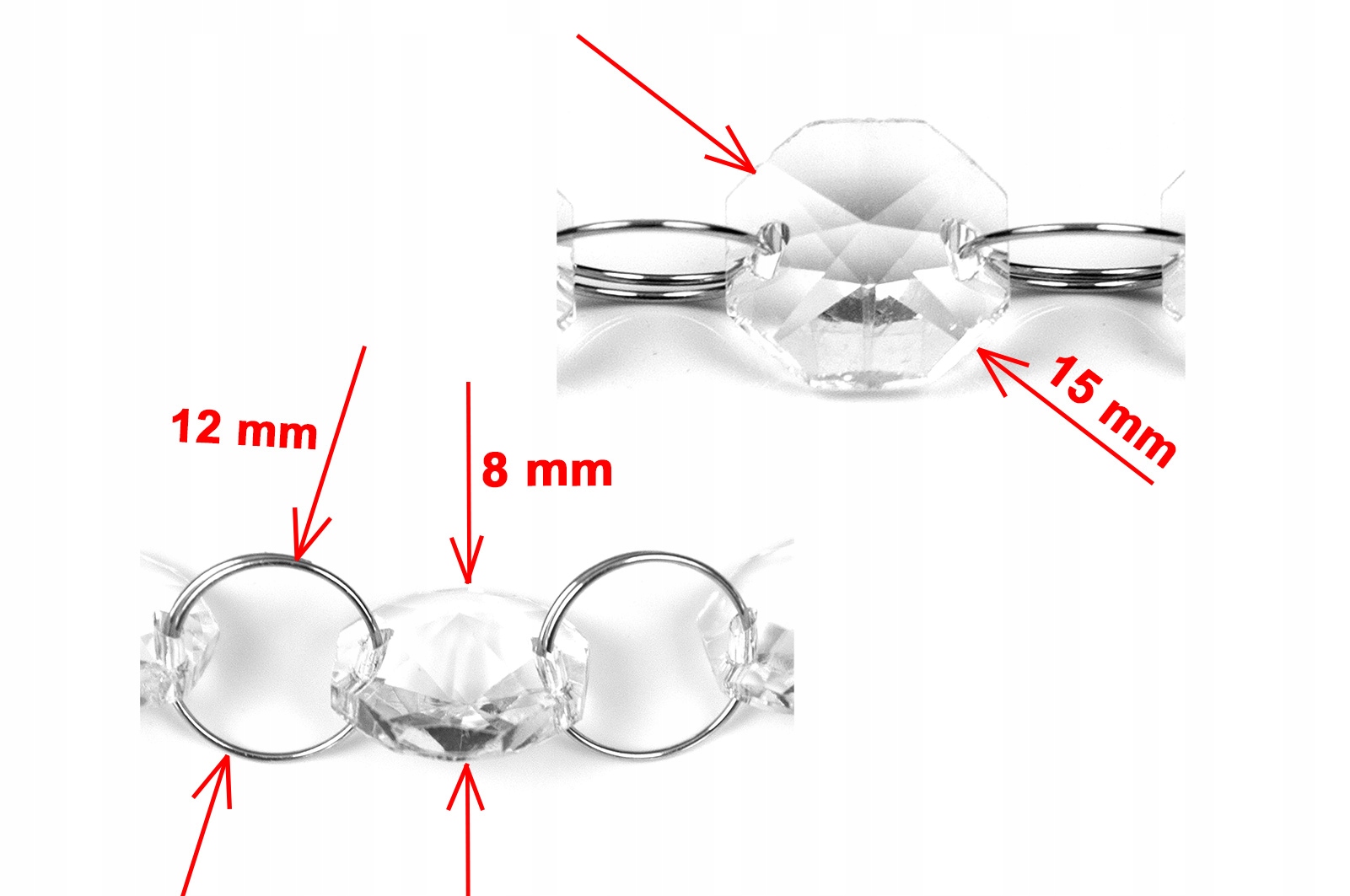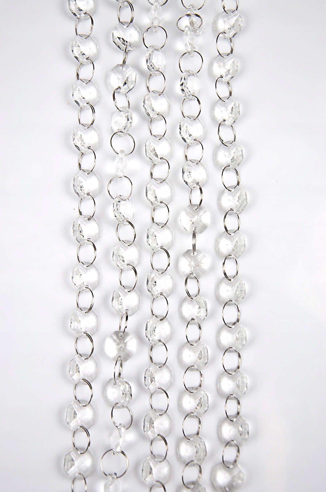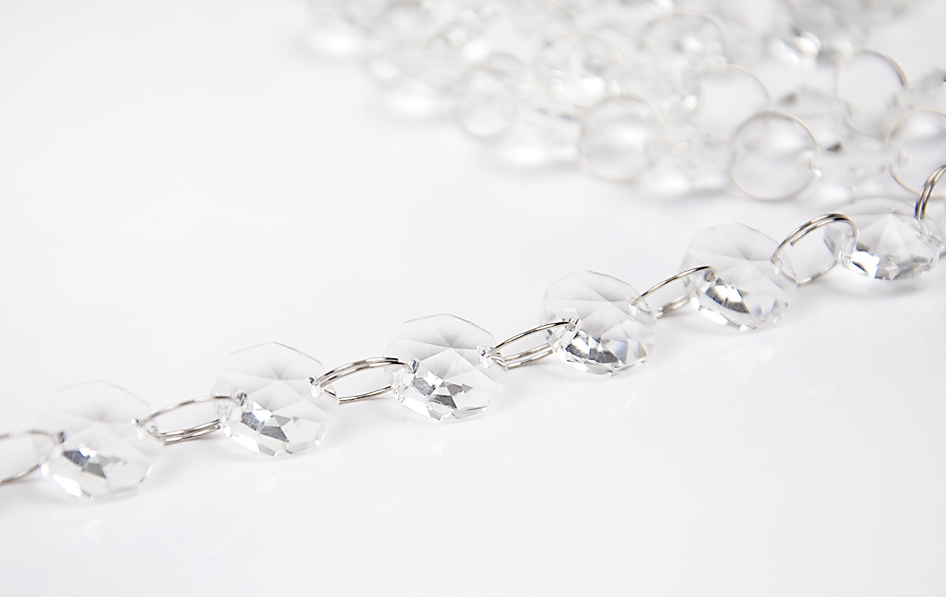 Кристали чудово розсіюють світло, додаючи інтер'єру шику, елегантності та стилю. Красиво виблискуючи як при денному, так і при штучному освітленні, вони висвітлять будь-який інтер’єр. Вони з'єднані між собою тонкими металевими кільцями діаметром 12 мм, що полегшує кріплення підвісок на жабо, шпильки та інші елементи кріплення. Кристали безбарвні, злегка конічні з обох сторін, восьмикутної форми та мають діаметр 15 мм.