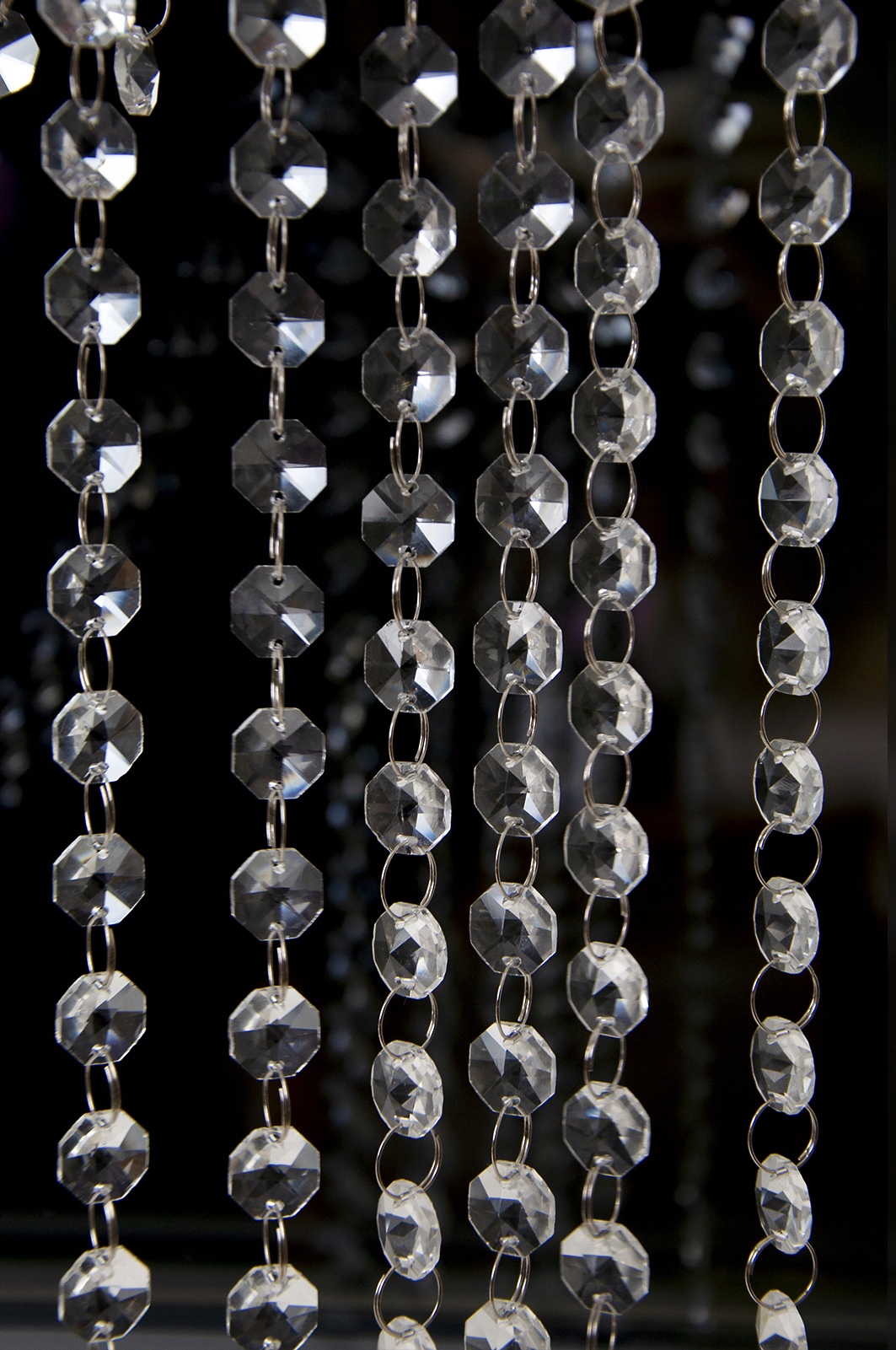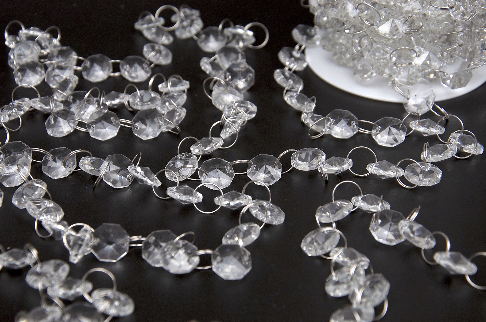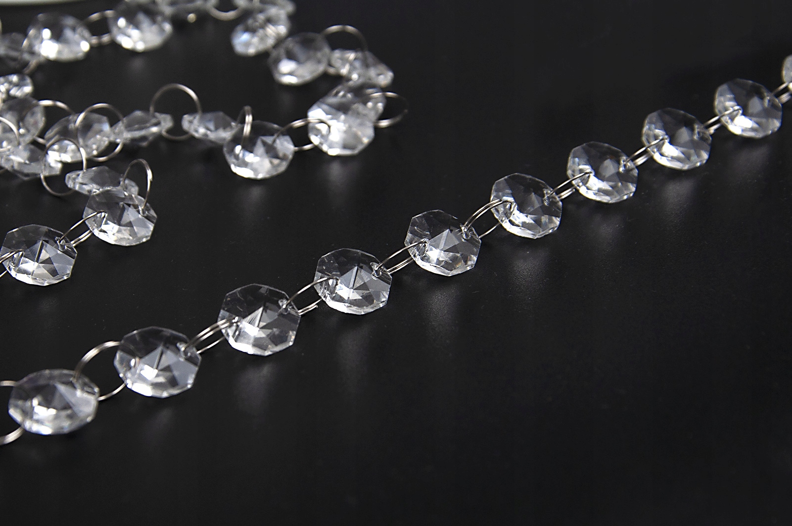 Кристали чудово розсіюють світло, додаючи інтер'єру шику, елегантності та стилю. Красиво виблискуючи як при денному, так і при штучному освітленні, вони висвітлять будь-який інтер’єр. Вони з'єднані між собою тонкими металевими кільцями діаметром 12 мм, що полегшує кріплення підвісок на жабо, шпильки та інші елементи кріплення. Кристали безбарвні, злегка конічні з обох сторін, восьмикутної форми та мають діаметр 15 мм.