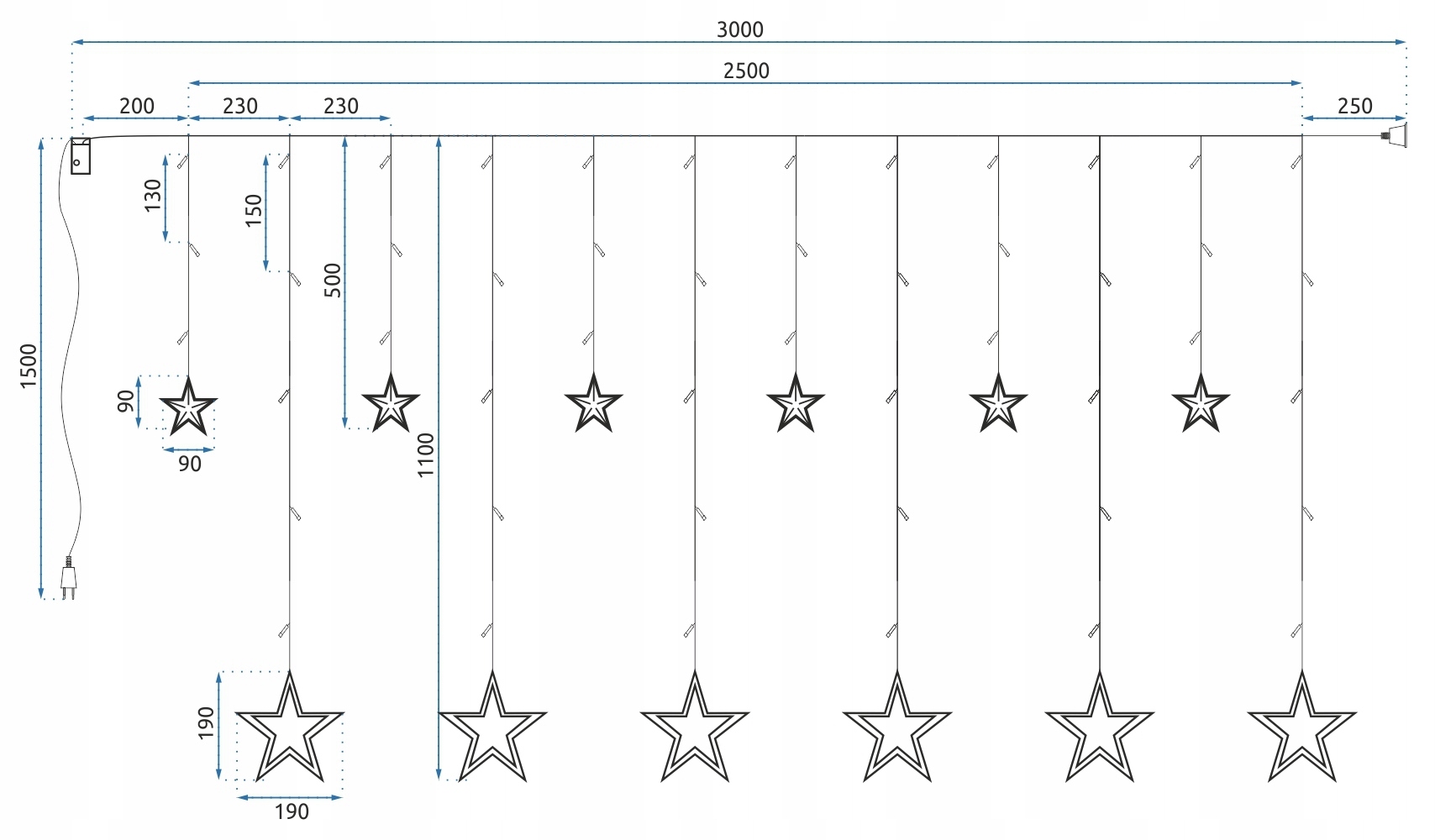 Набір Лампи складаються з 6 підвісних світлодіодних зірок розміром 19 х 19 см і 6 зірочок розміром 9 х 9 см. Довжина гірлянди 300 см.