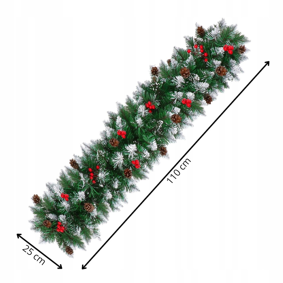 - Гірлянда має штучні хвойні гілки з ПВХ голками та декор: натуральні соснові шишки та штучна горобина
