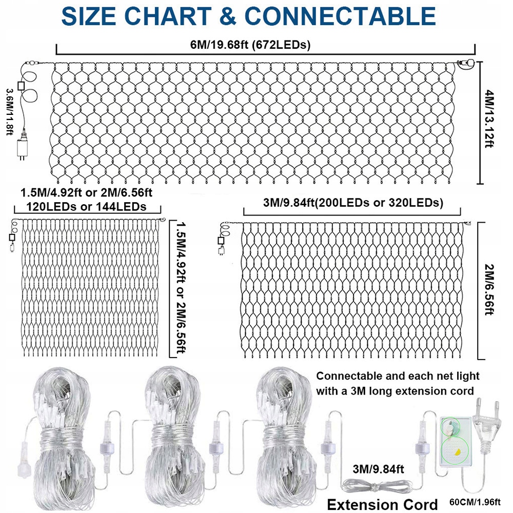 *Наддовгий кабель живлення: усі наші освітлювальні прилади з подовжувачем 1 шт. довжиною 3 метри, довжина кабелю штекера приблизно 0,6 метра, тому загальна довжина кабелю живлення становить близько 3,6 метрів, достатньо для зовнішнього використання, наприклад, розширення зони охоплення сітчастих ліхтарів до вражаюче великої світлової ковдри для покриття живоплотів, верхівок дерев, стін, живоплотів, кущів, парканів, стовбурів дерев, балюстрад, вікон, стовпів і колонки.