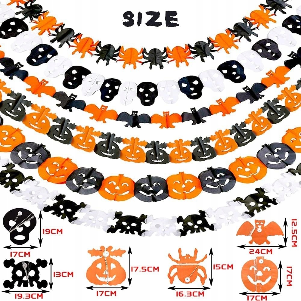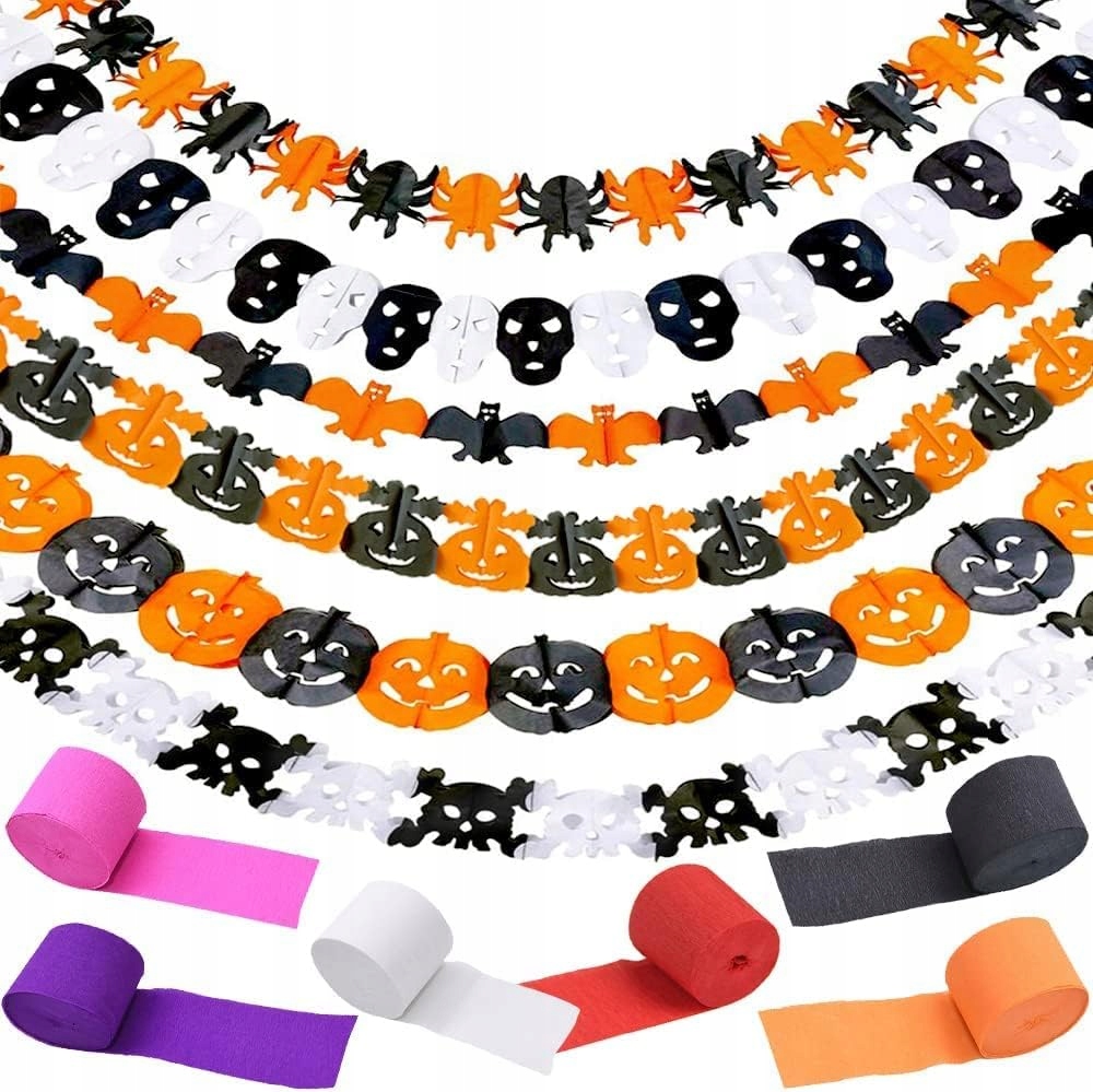 【Набір аксесуарів для Хелловіна】 6 гірлянд для Хелловіна (гарбуз, скелет, кажан, привид, павук, гарбуз) з листям), 6 різнокольорових рулонів крепового паперу, різноманітні декорації на Хелловін із справжніми ефектами.