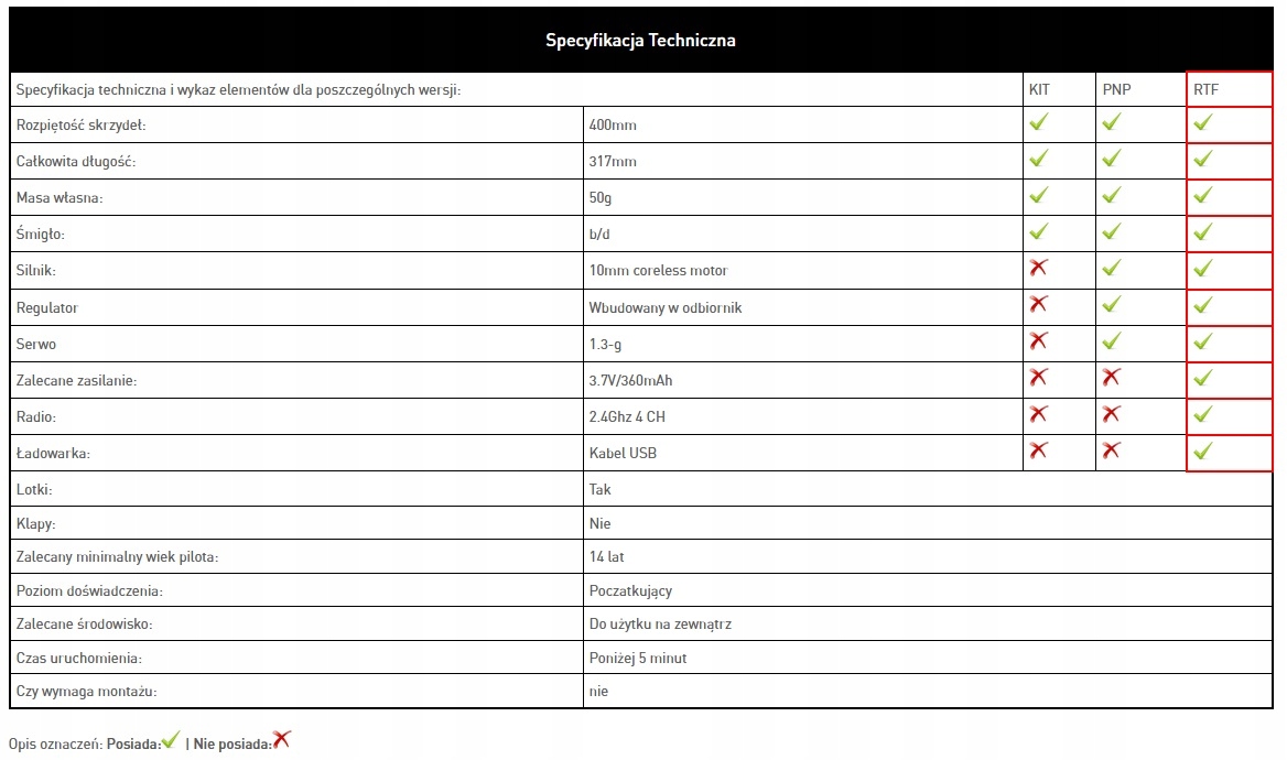 Літак у версії RTF, модель містить усі елементи, необхідні для польоту, такі як двигун, контролер, сервоприводи , акумулятор, зарядний пристрій, передавач і приймач. Щоб самостійно живити передавач, вам потрібно буде придбати 4 палички AA.
