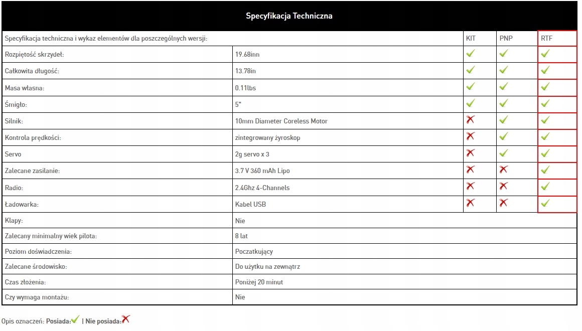 Літак у версії RTF, модель містить усі елементи, необхідні для польоту, такі як двигун, контролер, сервоприводи, акумулятор, зарядний пристрій, передавач і приймач. Щоб самостійно живити передавач, вам потрібно буде придбати 4 палички AA.