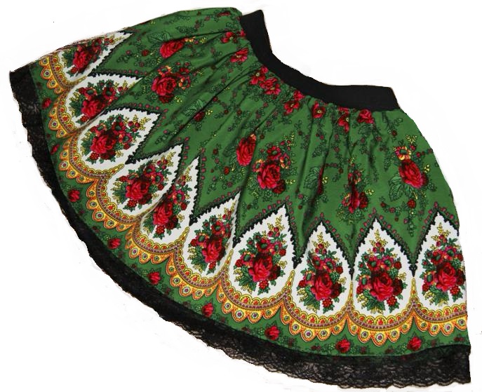 Спідниця з квітковим візерунком горця на зеленому тлі, підбитий чорним тюлем, оздоблений мереживом. Талія широка