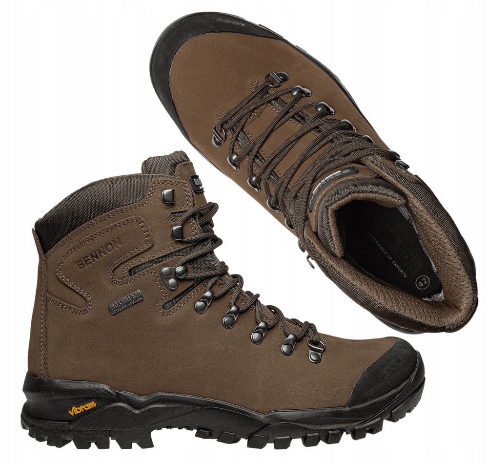 ЧЕРОБИКИ TERENNO HIGH/ BENNON. Шкіряні трекінгові черевики з водонепроникною мембраною REGI-TEX® і нековзкою підошвою VIBRAM®. Зручне трекінгове взуття, розроблене для забезпечення хорошого зчеплення, довговічності та підтримки суглобів у складних умовах місцевості. Взуття має хорошу амортизацію і підтримку, що допомагає знизити навантаження на ноги під час тривалих походів, забезпечує комфорт і допомагає уникнути травм. Тверда підошва забезпечує хороше зчеплення з різними видами місцевості, що важливо при скелелазінні, прогулянках в горах і по кам'янистих стежках. Колір: коричневий.Верх: верх - нубук. Підкладка - мембрана REGI-TEX®. Підкладка - ABSORBA. Конструкція: висока верхня частина з м’яким обробленим коміром і язиком, регульована за допомогою шнурівки, шар спереду, який захищає взуття від стирання, добре вирізняна гумова підошва Vibram® S1021. Підошва VIBRAM® є однією з найкращих у своєму класі, її часто вибирають виробники спортивного та вуличного взуття завдяки чудовому зчепленню, довговічності та стійкості до стирання, вона задовольнить різноманітні потреби та умови. Застосування: гірські походи, альпінізм, експедиції у важкодоступні райони, польові роботи (лісники, природоохоронці).