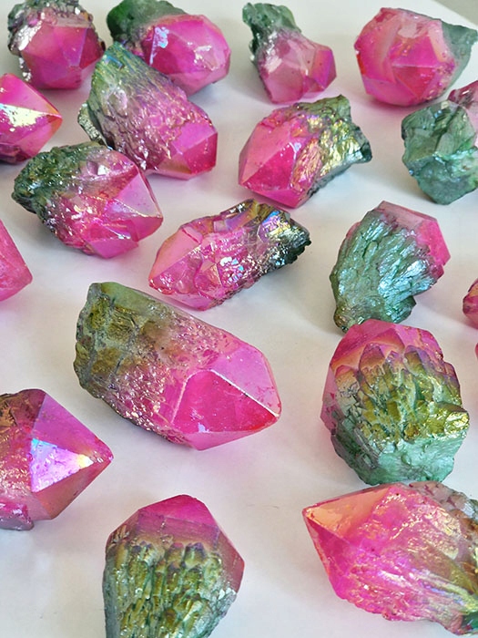 Це натуральний гірський кришталь, покритий платиною та сріблом, іноді золотом, що створює ефект переливчастої веселки.