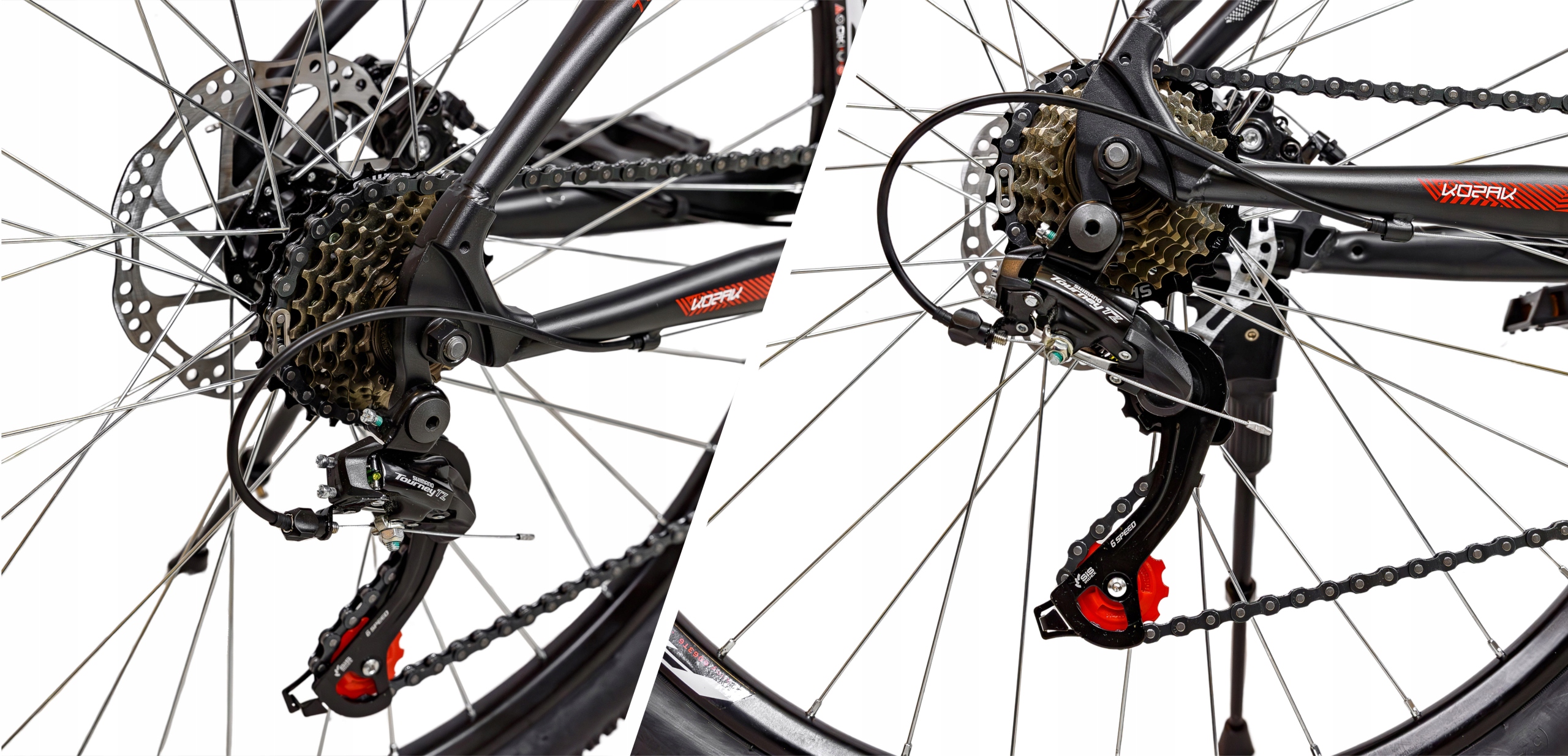 Велосипед оснащений Freewheel Shimano, , який забезпечує рідку та точну зміну передач . Завдяки надійності цього бренду ви можете легко адаптувати передачу до кожної області - від крутих підйомів до швидких спусків.