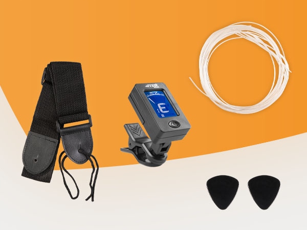 Ця класична гітара має 6 нейлонових струн і важить лише 1,25 кг, що робить його ідеальним для наймолодших гітаристів. Набір також включає корисні аксесуари, такі як: