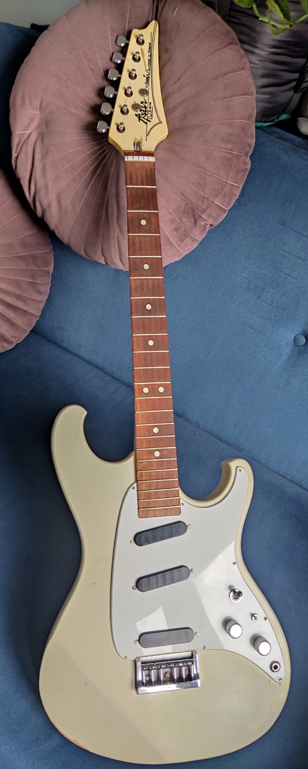 На гітарі багато років грали на гітарі, потім її залишили в гаражі на багато років, а тепер. По дорозі зазнала дрібного ремонту скрипки. На сьогоднішній день лади потерті, звукознімачі гудуть/пищать, фарба місцями потріскана, немає одного гвинта для підняття струни на бриджі (видно на фото), немає кріплення ремінця, електроніка не працює. заплямований. Взагалі гітара потребує повного ремонту, можна сказати, що "Biały Kruk" має високу колекційну цінність, тому варто провести ремонт.