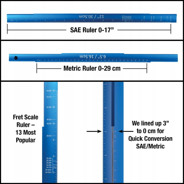 Включає лінійки SAE та метричні лінійки для швидких вимірювань, а також 13 найпопулярніших довжин ладів для гітари та бас-гітари, щоб ви могли швидко перевірити масштаб будь-якої гітари чи бас-гітари на столі. Крім того, починаючи з 12-го лада, ви можете швидко перевірити приблизне положення містка за допомогою лінійки довжини ладу. Лінійка довжини масштабу також допомагає визначити, який MusicNomad Fret Shield (продається окремо) купити.