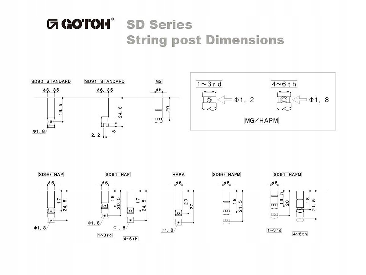 GOTOH GUT Co. це єдиний японський виробник деталей для струнних інструментів, початок якого сягає 1960 року. З тих пір вона є провідним виробником гітарних аксесуарів найвищого класу, яку цінують найбільші виробники гітар (Fender, Gibson, Ibanez, ESP) і найвидатніші майстри. Серія SD включає старовинні гайкові ключі з кількома варіантами хвостовика: від стандартних, з регульованою висотою, із замком, до комбінації двох останніх під назвою HAPM. Дуже хороша якість, точність виготовлення та гарантія стійкого спорядження.