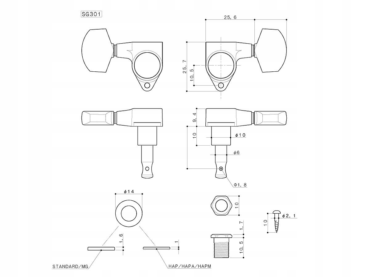 GOTOH GUT Co. це єдиний японський виробник деталей для струнних інструментів, початок якого сягає 1960 року. З тих пір вона є провідним виробником гітарних аксесуарів найвищого класу, яку цінують найбільші виробники гітар (Fender, Gibson, Ibanez, ESP) і найвидатніші майстри. Серія SG301 є дуже популярною серією, яка замінює GROVER моделі 102 і 502. Найбільш часто використовуваний стандарт з одним гвинтом знизу (90 градусів) традиційно пропонує кілька варіантів штифтів, від стандартних, що регулюються по висоті, до комбінації двох останніх під назвою HAPM. Багато версій ручок і обробки на вибір. Дуже хороша якість, точність і гарантія стабільного одягу. У набір входять всі необхідні елементи для складання: втулки, шайби та гвинти.