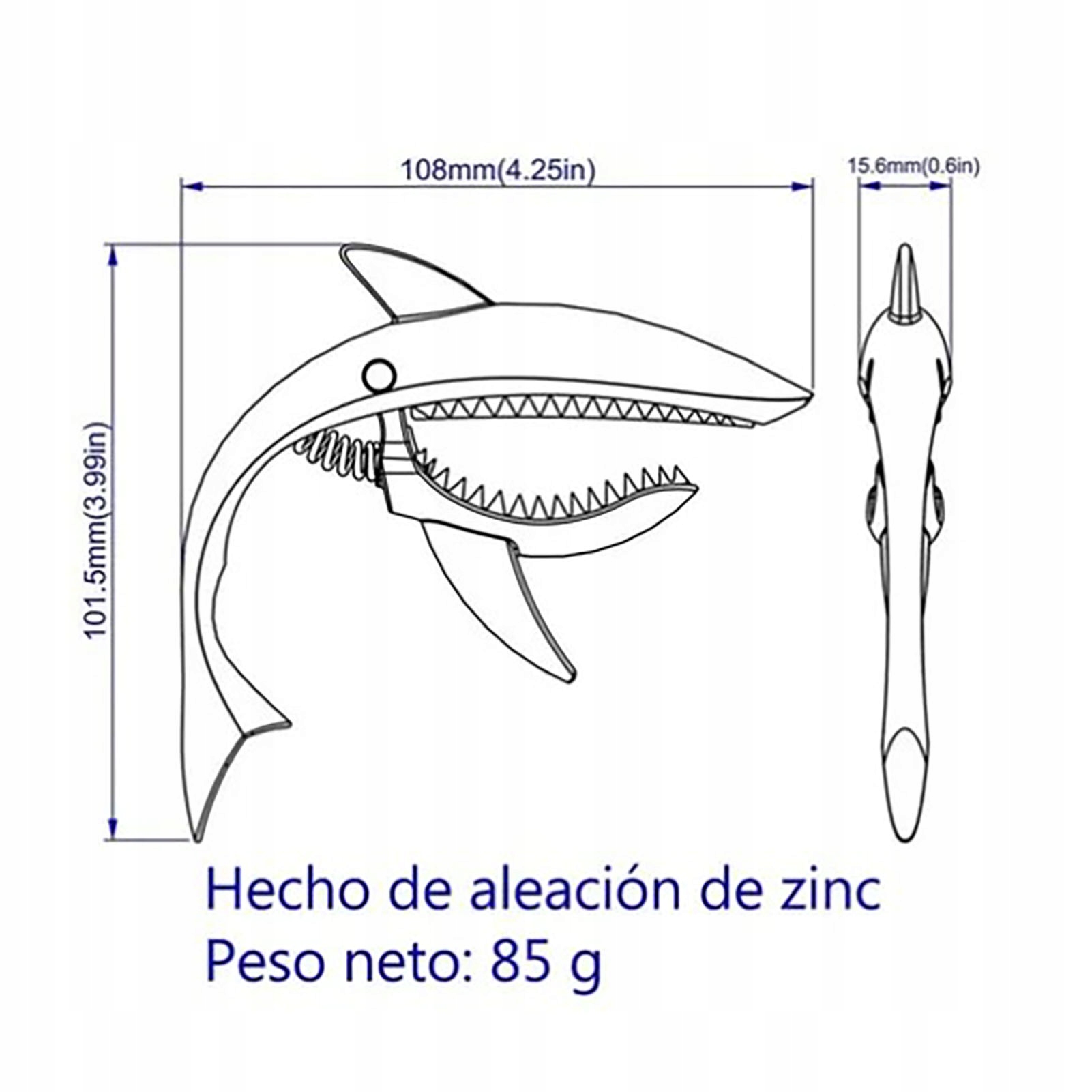 1, стабільна фіксація: ця гітарна капода має гарне зчеплення та фіксується на місці. Немає явного шуму, що забезпечує гарне використання. 2、Силіконова накладка: силіконова накладка на цьому гітарному капо може ефективно запобігти пошкодженню гітари. Ви можете вибрати його без жодних турбот! 3、Проста заміна: цей гітарний каподап простий у використанні та дуже швидко замінюється, навіть змінюючи тональності в піснях. 4、Широке застосування: цей гітарний каподап широко використовується в акустичній гітарі, електрогітарі або банджо, класичній гітарі. 5、Візерунок акули: цей гітарний каподап розроблено з візерунком акули, який є дуже делікатним і сучасним. Він також чудово підійде як подарунок.