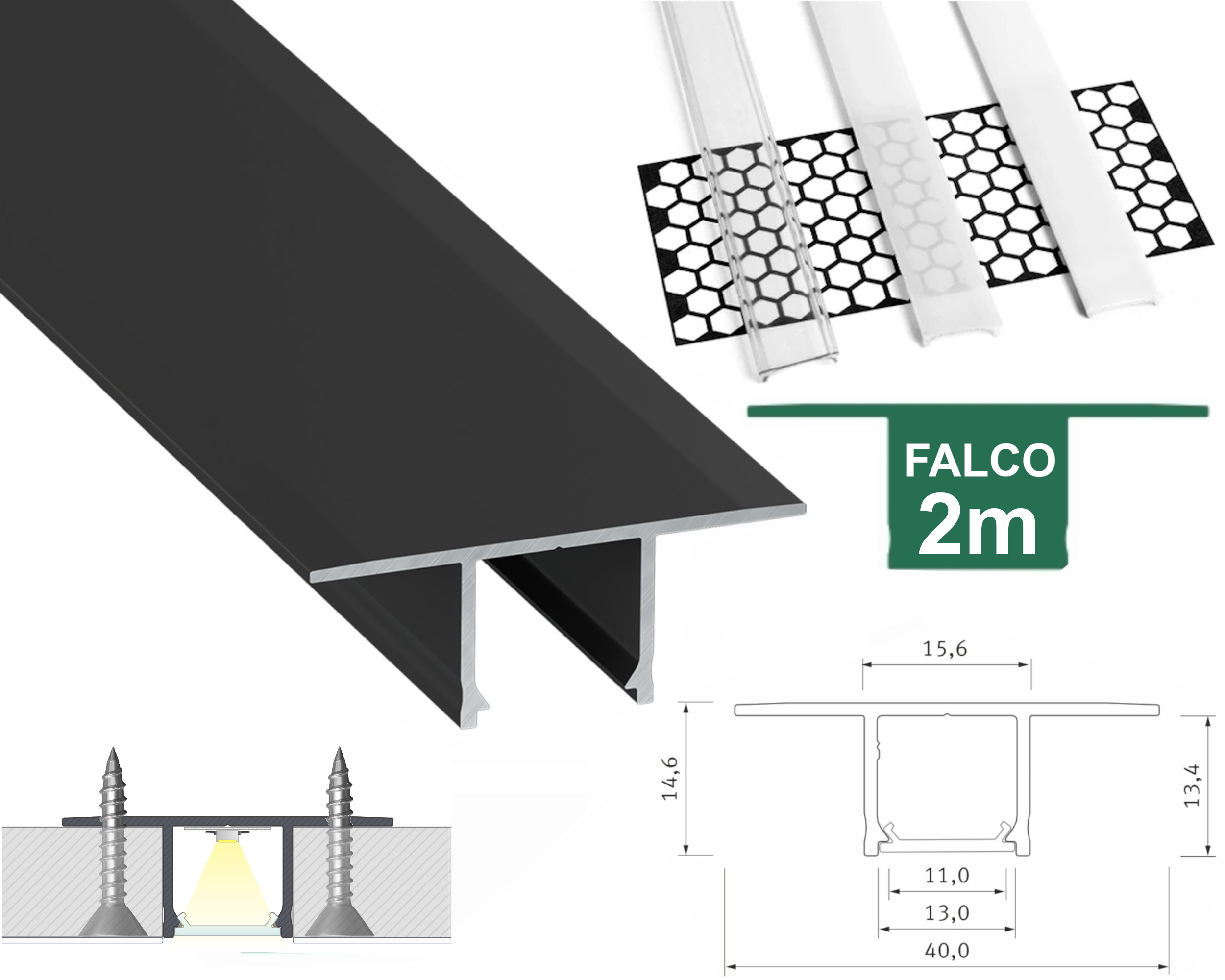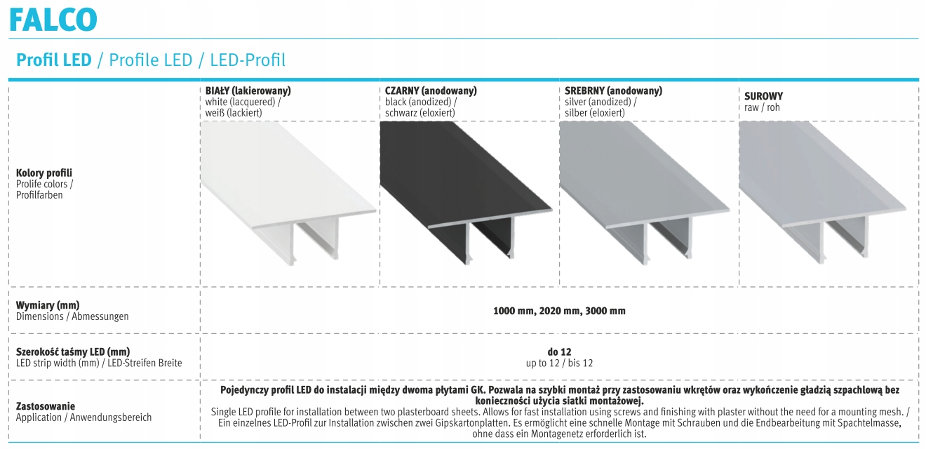 Тип алюмінієвого профілю falco розроблений для поглибленої установки з широким спектром додатків. Один світлодіодний профіль для встановлення між двома табличками GK. Це дозволяє швидко складати, використовуючи гвинти та закінчуючи шпаклівку без необхідності використання кріпильної сітки.