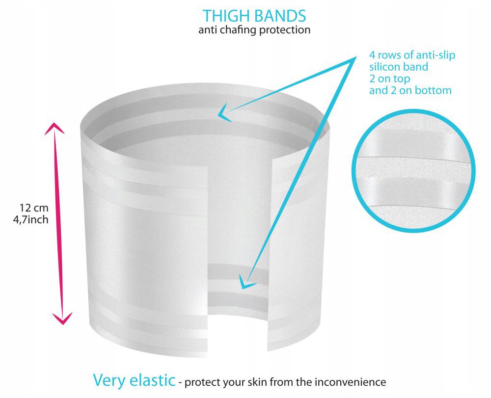 SATIN THIGH BAND – це фантастичний ремінець для стегон для людей, які борються з неприємними саднами на стегнах. Завдяки нашим пов'язкам проблема зникає, і ви знову відчуваєте себе комфортно в теплі дні. Виріб виготовлено з трикотажу найвищої якості, шириною 12 див. Завдяки подвійним силіконовим смужкам на верхньому та нижньому кінцях ремінець ідеально прилягає до стегна та не сповзає.