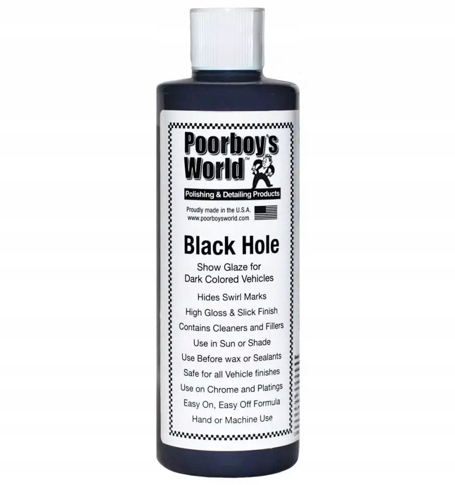 Poorboy's Black Hole Glaze - дивовижний, простий у використанні поліроль для темних автомобільних фарб, який дбайливо очищає пофарбовані поверхні та маскує дефекти. Залишає гладку, дзеркальну поверхню фарби та блиск, гідний найкращого автосалону. Готує поверхню до захисту за допомогою захисного покриття у вигляді герметика або воску. Poorboy's Black Hole Glaze — майстер ілюзії «мокрого лаку». Він приховує подряпини, що виникають в результаті повсякденного використання, які видно на темному лаку. Продукт можна використовувати скільки завгодно часто.