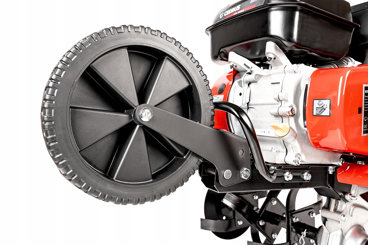 Бензинова фреза GL500 - це потужна і компактна машина, призначена для роботи в будь-яких умовах і в будь-якому саду. Культиватор оснащений верхньоклапанним двигуном об'ємом 196 куб.см, з чавунною гільзою циліндра та масляним повітряним фільтром. Румпель має коробку передач, що дозволяє лезам працювати на двох швидкостях вперед і одній швидкості назад. У базову комплектацію та вартість машини входять гумові колеса, завдяки яким ми можемо швидко перетворити фрезу в мікротрактор, який може працювати з плугом, окучником або копачем.