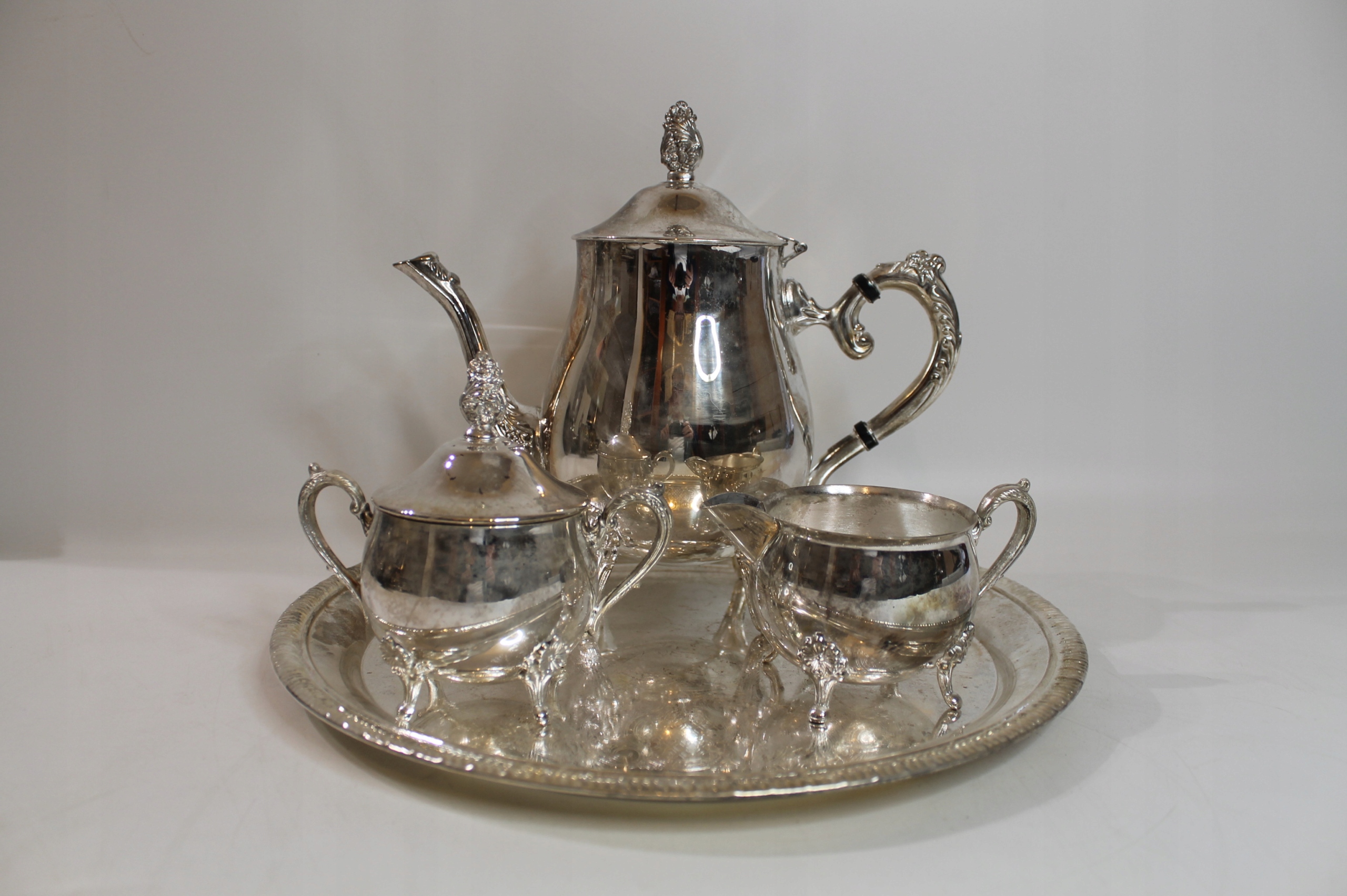 Предметом продажу є унікальний, гарно декорований, ретельно виготовлений срібний набір — глечик для кави/чаю, цукорниця та глечик для молока на підносі.