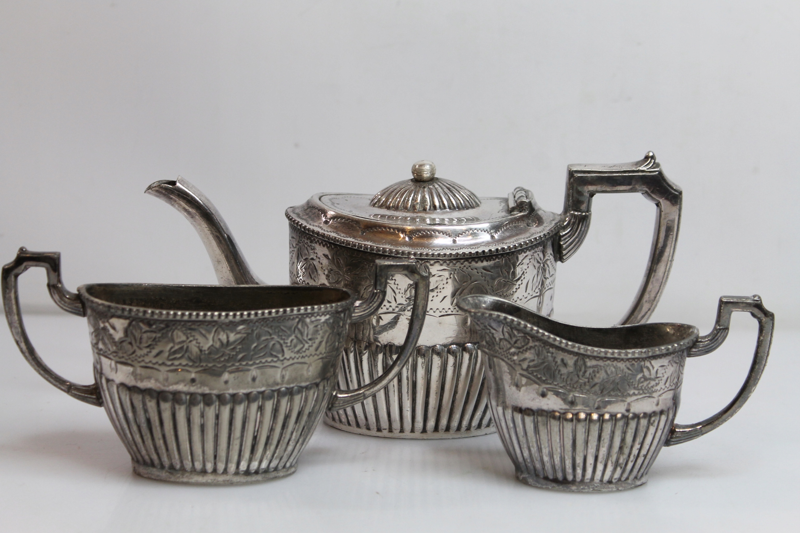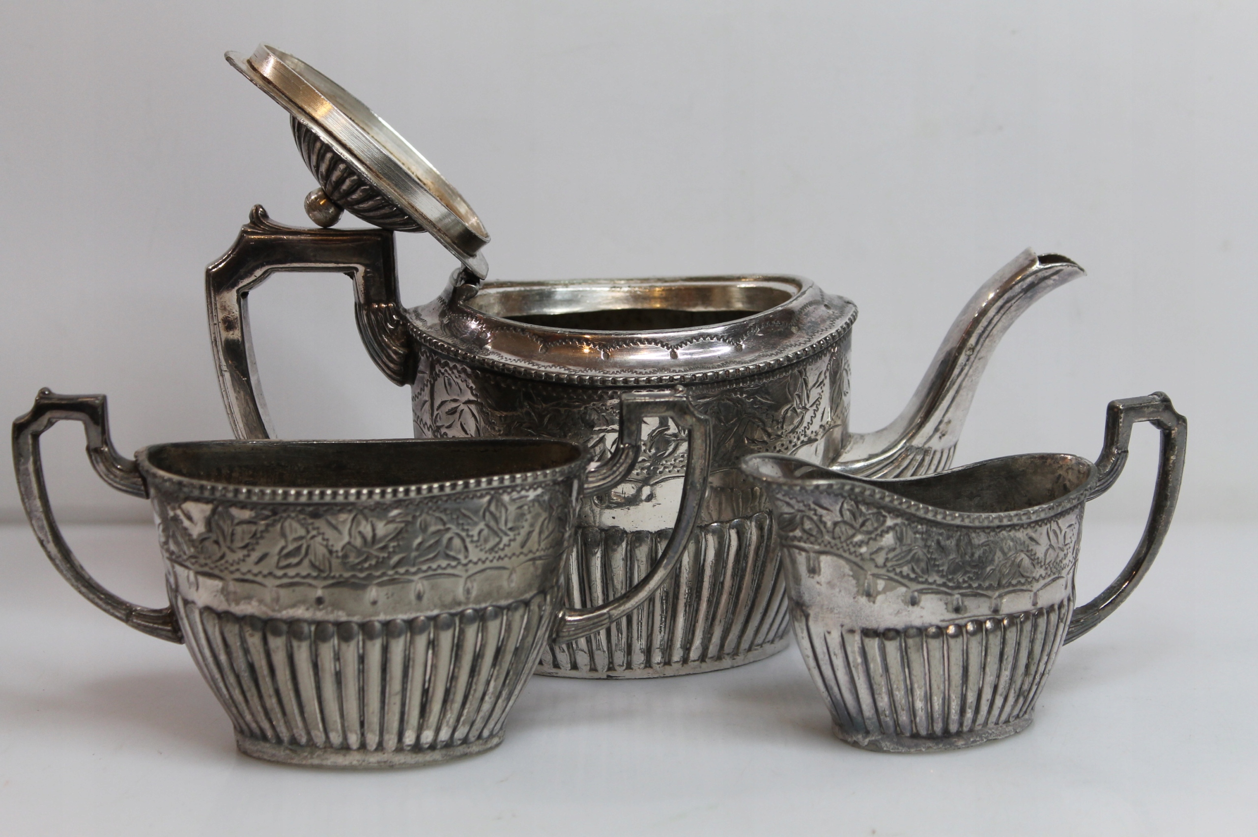 Предметом продажу є унікальний старовинний, красиво оздоблений, ретельно виготовлений срібний набір — кавник/чайник, цукорниця та молочник.