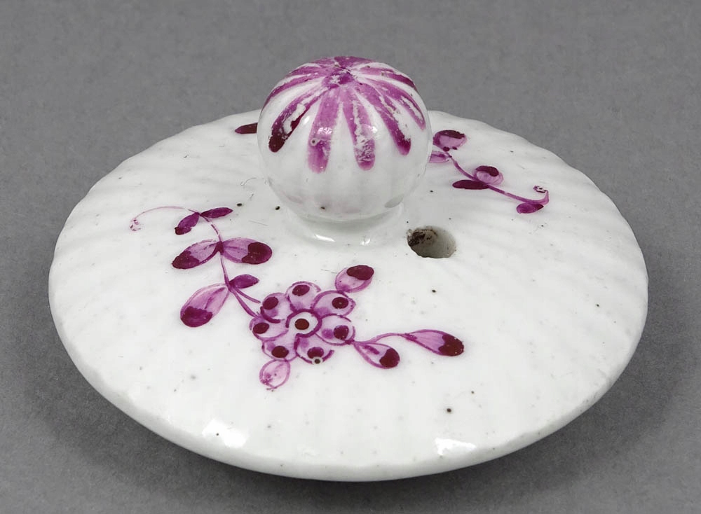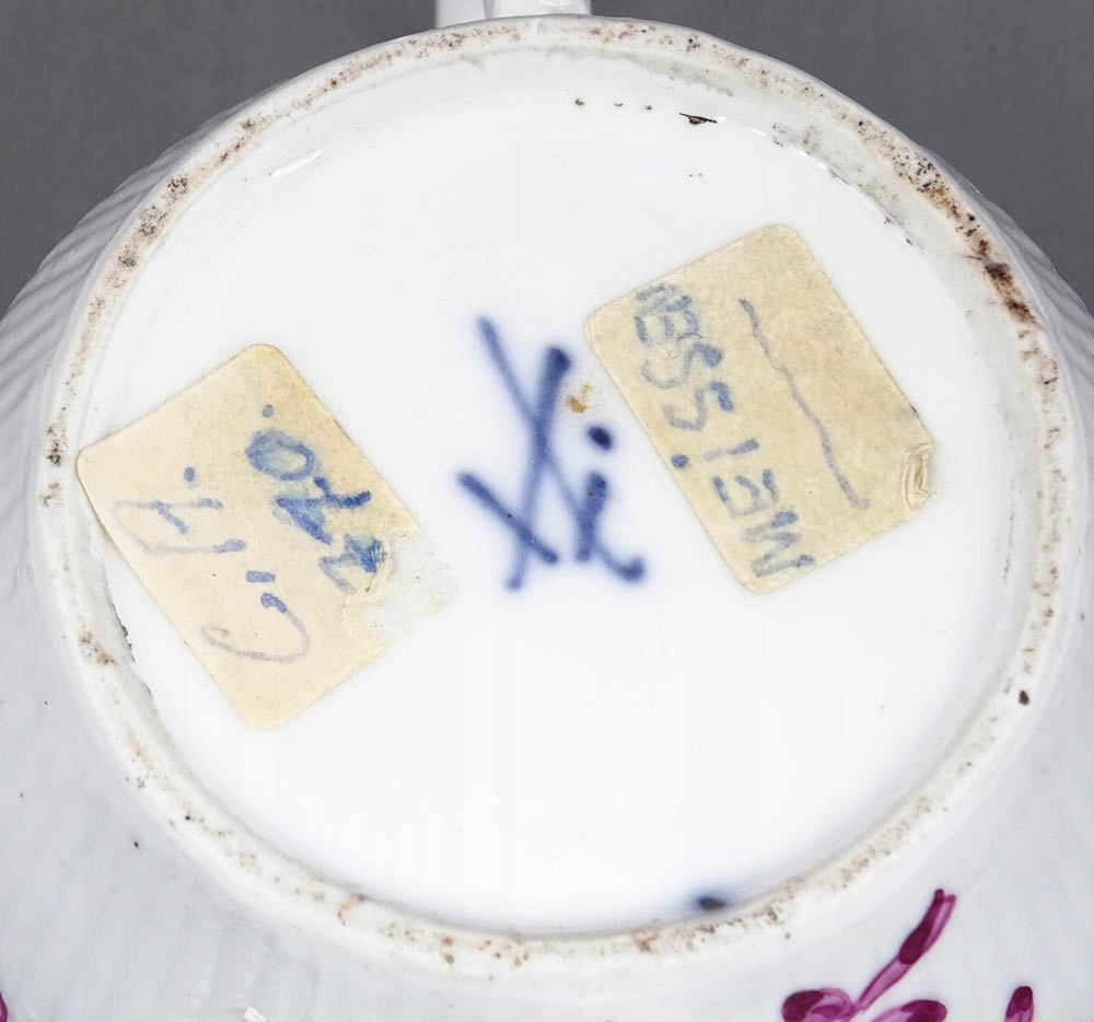 Підписано знизу кобальтовою глазур’ю у формі двох пересічних мечів. Цей екземпляр датується 1763-1773 роками, це знак майсенської мануфактури, яка використовувалася у другій половині 18 століття.