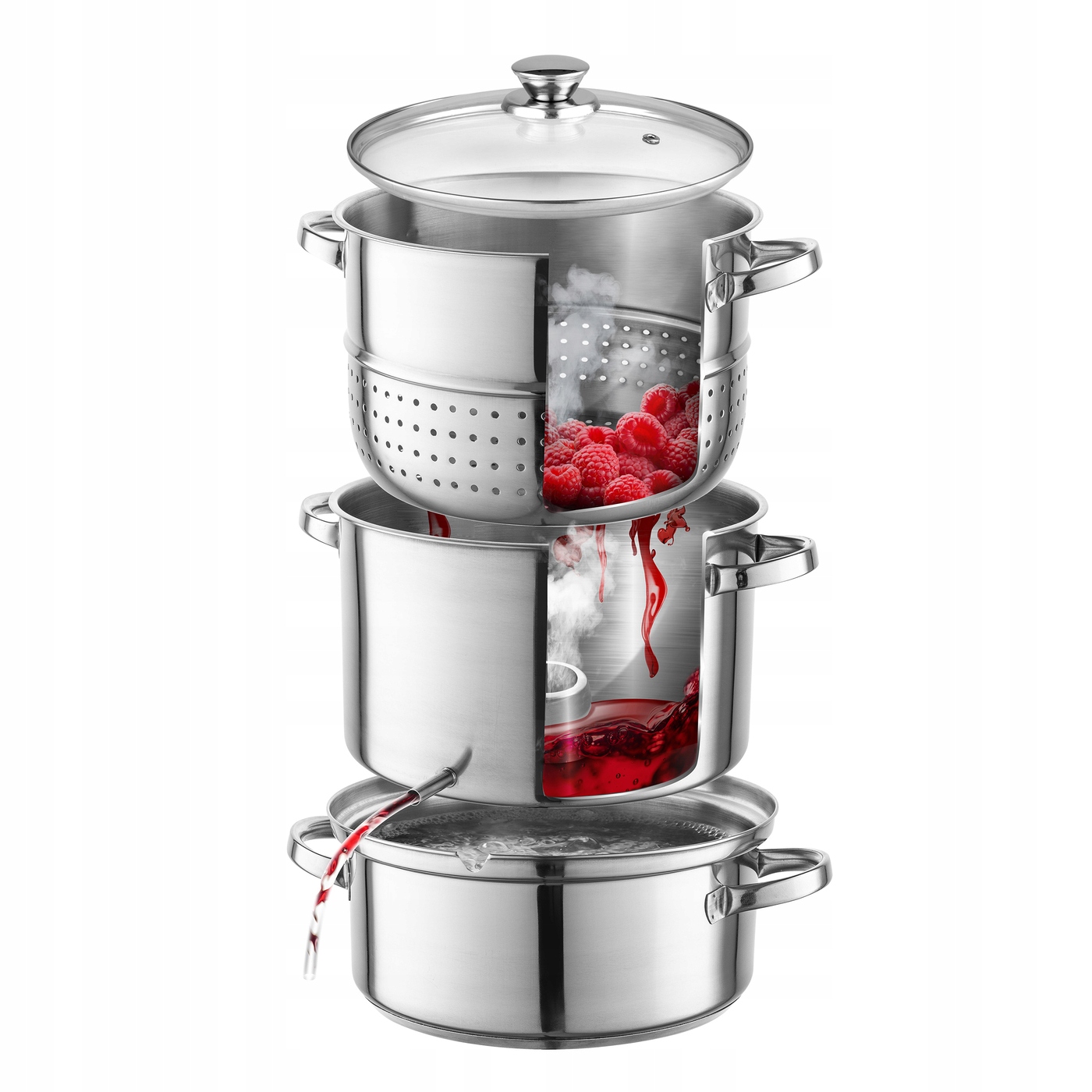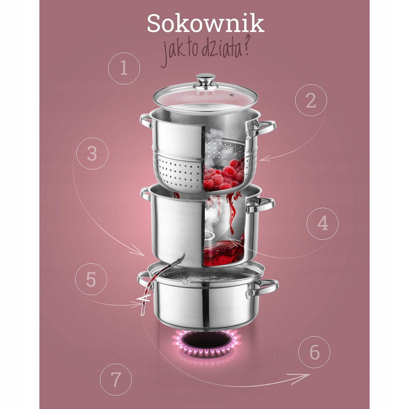 Соковижималки виготовлені з дуже високоміцної нержавіючої сталі (стійкої до навантажень і температур). Призначені для всіх типів плит. Їх також можна мити в посудомийних машинах. Набір складається з трьох штабелюваних посудин: