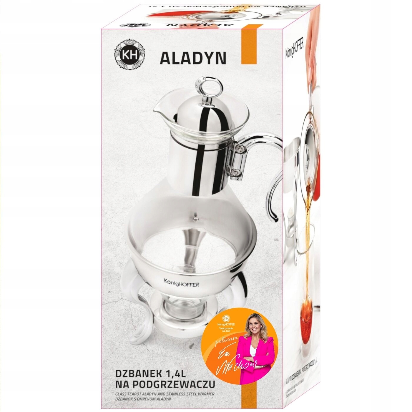 Глечик KonigHOFFER Aladyn 1,4 л - це стилізована посудина, яка дозволяє елегантно та ефектно подати каву або чай. Завдяки своїй унікальній формі та оздобленню (гравірування, стрази) він стане чудовою прикрасою столу та відмінним подарунком. Декоративна підставка для підігріву гарантує, що напій тривалий час залишається гарячим. Виготовлений з високоякісного боросилікатного скла та нержавіючої сталі, це означає довговічність і чудовий зовнішній вигляд протягом багатьох років. Продукт рекомендований Ewa Wachowicz. Як амбасадор бренду Konighoffer, вона тепло та з усмішкою рекомендує його для домашнього використання. Разом з ним ви отримаєте свій рецепт для дому. Це один з найкращих варіантів у цій категорії!