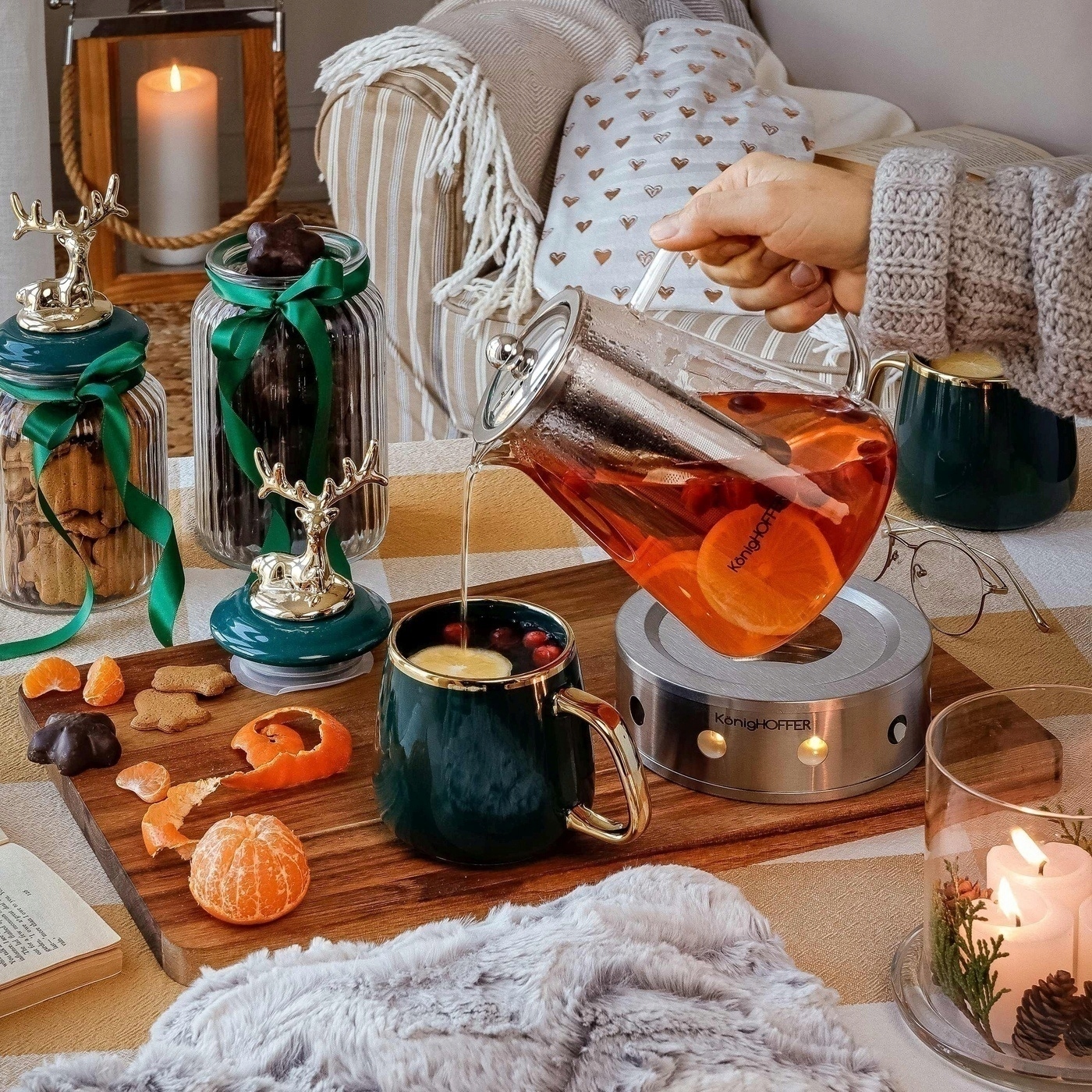 Чайник Konighoffer Tibi 1,3 л виготовлений з боросилікатного скла. Можна використовувати для холодних і гарячих напоїв. Більш того, ви зможете заливати окріп прямо в чай. Це можливо завдяки тому, що використовуване боросилікатне скло має високий коефіцієнт стійкості до термічного удару. Він також добре захищений від потемніння і його важко подряпати. Це означає, що в ньому можна сміливо готувати чай і навіть ставити його на обігрівач. Ви також отримаєте комфорт і точність у подачі та розливі напоїв. Глечик Tibi має велику ергономічну ручку та практичний носик. Таким чином, ви можете доповнити свій домашній набір для кави та тістечок стильним скляним глечиком. Його кришка виготовлена зі сталі. Інфузор з нержавіючої сталі призначений для збереження всіх добавок до напоїв під час розливання їх у келихи. Ви можете використовувати продукт при температурі до 120 градусів С. Сам скляний глечик можна мити в посудомийній машині. Глечик з нержавіючої сталі. З ним ви надовго збережете чай у каструлі теплим. Ви також отримаєте модель, яка є стабільною, міцною та добре підходить для вашого кавового сервізу. Крім того, ви подбаєте про те, щоб чайна свічка, поставлена всередину, не впала. Він також матиме достатній запас повітря для підтримки полум’я. Ви неодмінно отримаєте ідеальну сталеву підставку з нагрівачем для глечика Tibi. Варто обрати цю модель, щоб уся світська зустріч завжди пройшла успішно, а ваш запас свіжозавареного чаю був у безпеці.