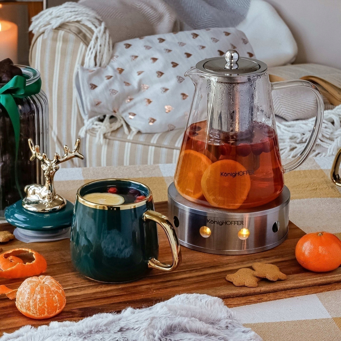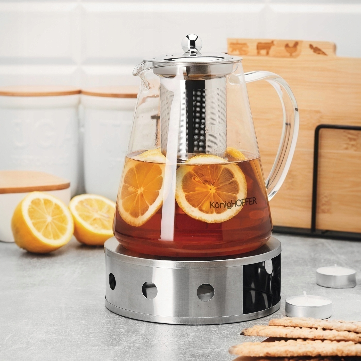 Чайник Konighoffer Tibi 1,3 л виготовлений з боросилікатного скла. Можна використовувати для холодних і гарячих напоїв. Більш того, ви зможете заливати окріп прямо в чай. Це можливо завдяки тому, що використовуване боросилікатне скло має високий коефіцієнт стійкості до термічного удару. Він також добре захищений від потемніння і його важко подряпати. Це означає, що в ньому можна сміливо готувати чай і навіть ставити його на обігрівач. Ви також отримаєте комфорт і точність у подачі та розливі напоїв. Глечик Tibi має велику ергономічну ручку та практичний носик. Таким чином, ви можете доповнити свій домашній набір для кави та тістечок стильним скляним глечиком. Його кришка виготовлена зі сталі. Інфузор з нержавіючої сталі призначений для збереження всіх добавок до напоїв під час розливання їх у келихи. Ви можете використовувати продукт при температурі до 120 градусів С. Сам скляний глечик можна мити в посудомийній машині. Глечик з нержавіючої сталі. З ним ви надовго збережете чай у каструлі теплим. Ви також отримаєте модель, яка є стабільною, міцною та добре підходить для вашого кавового сервізу. Крім того, ви подбаєте про те, щоб чайна свічка, поставлена всередину, не впала. Він також матиме достатній запас повітря для підтримки полум’я. Ви неодмінно отримаєте ідеальну сталеву підставку з нагрівачем для глечика Tibi. Варто обрати цю модель, щоб уся світська зустріч завжди пройшла успішно, а ваш запас свіжозавареного чаю був у безпеці.