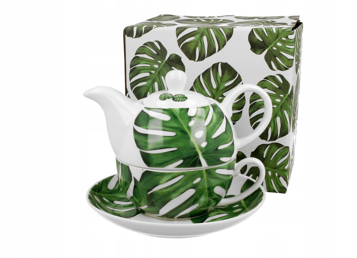 Чашка та глечик із серії MONSTERA. Набір є частиною лініїTropical, яка виготовлена з порцеляни New Bone China, що характеризується елегантним і природним кремово-білим кольором з ніжним блиском, а також винятковою міцністю, зберігаючи при цьому легкість і тонкість. Колекція виготовлена з білої порцеляни, прикрашеної мотивом величезного пальмового листя. Поєднання білого та зеленого створює гармонійну, але водночас надзвичайно цікаву композицію, ідеальну для любителів оригінального дизайну.