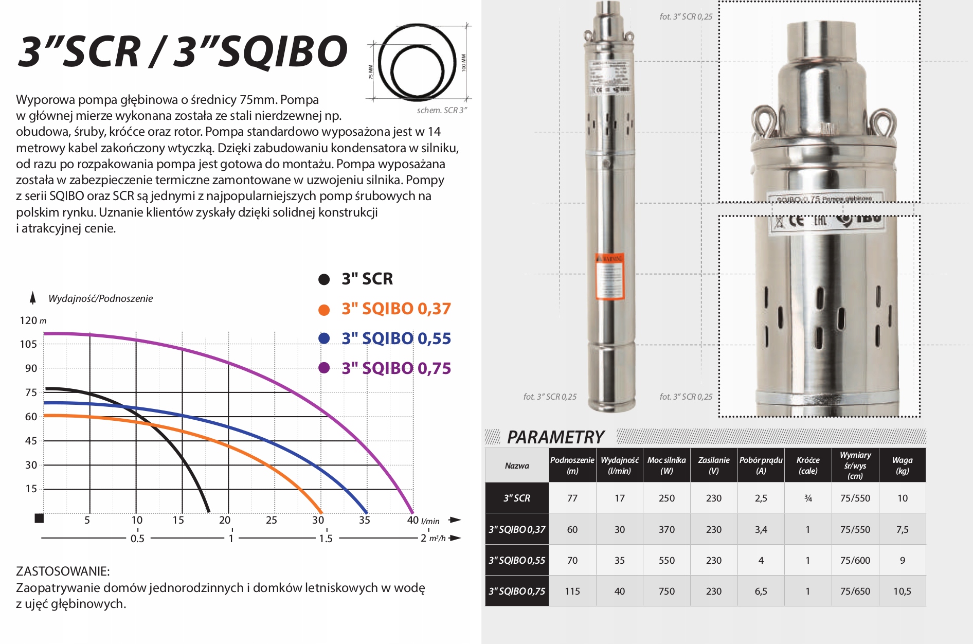 Об’ємні глибоководні насоси діаметром 75 мм 3” SCR. Насоси в основному виготовлені з нержавіючої сталі, наприклад, корпус, гвинти, заглушки та ротор. Насоси оснащені електричними кабелями різної довжини, що закінчуються вилкою, залежно від потреб користувача (14 м).