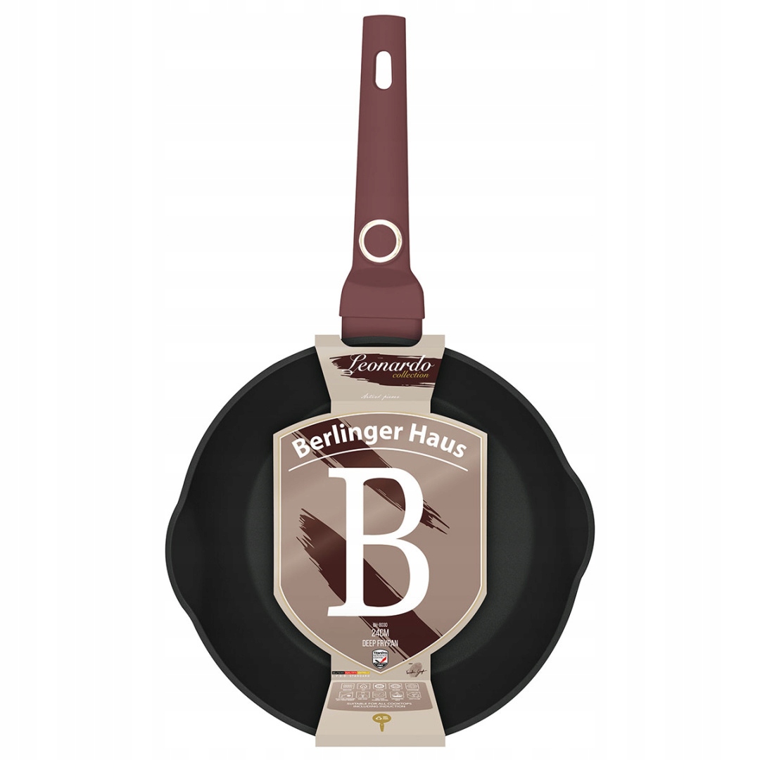 горщики, каструлі та аксесуари з серії колекцій Berlinger Haus Leonardo виготовлені з високого класу алюмінію, покритого всередині з потрійним титановим титановим покриттям з дуже високим коефіцієнтом твердості. Зовнішнє покриття в матовому бургундії. Ці привабливі та модні страви оснащені як стандартні з м'яким дотиком (силіконова ручка). Пристосований до всіх видів плит: газ, електричний, керамічний, галоген, індукція. Система турбо -індукції (вони нагріваються дуже швидко) економить до 35% енергії.