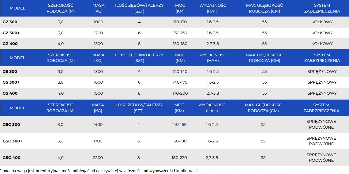 - Вал - трубчастий 500/600мм, пакувальник 500/600мм, струна 500 мм, пружина 450/550 м, дах 500/600 мм, T-образна балка 500/600 мм, U-образна балка 500/600 мм, тандемний U-образний вал 500 мм, Crosskill 500 мм
