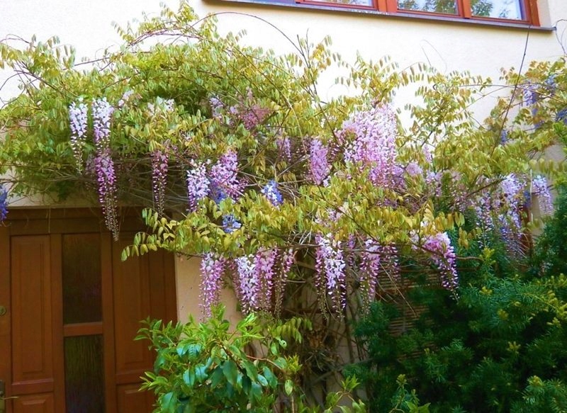 Гліцинія рожева, також відома як рожева гліцинія, — це ефектна лазяча рослина з ефектними довгими кистями рожевих квітів, які з’являються навесні, зазвичай у травень і червень. Цей сорт гліцинії характеризується здатністю швидко рости, досягаючи в довжину до 10-20 метрів. Квіти не тільки красиві, але й ароматні, що робить його привабливим не тільки візуально, але й запахом. Листя велике, зелене, створює щільний і привабливий дах.