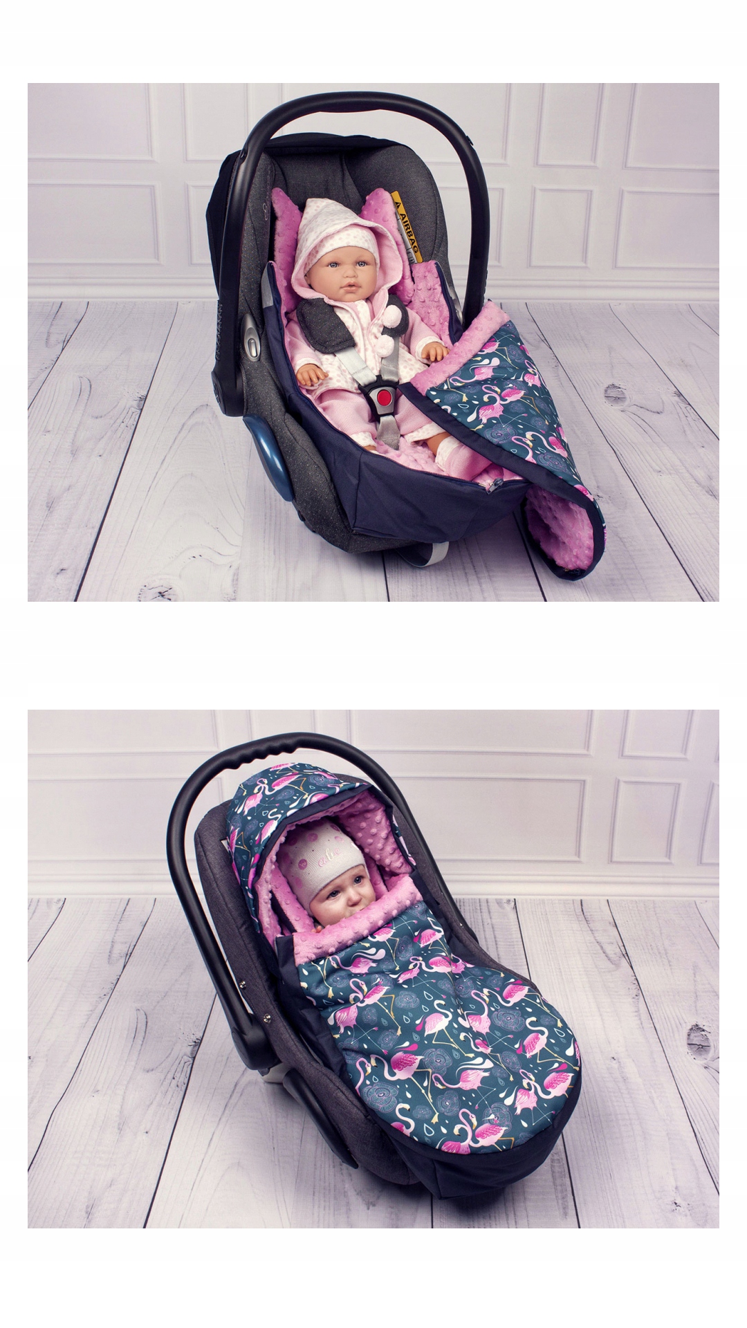 • Підходить для всіх дитячих переносок, також п'ятиточкових, завдяки використанню спеціальних блискавок які дозволяють ідеально підлаштувати отвори для ременя відповідно до висоти ручок дитини. Відкривання блискавок в отворах дозволяє швидко вставляти та витягувати дитину, загорнуту в спальний мішок.
