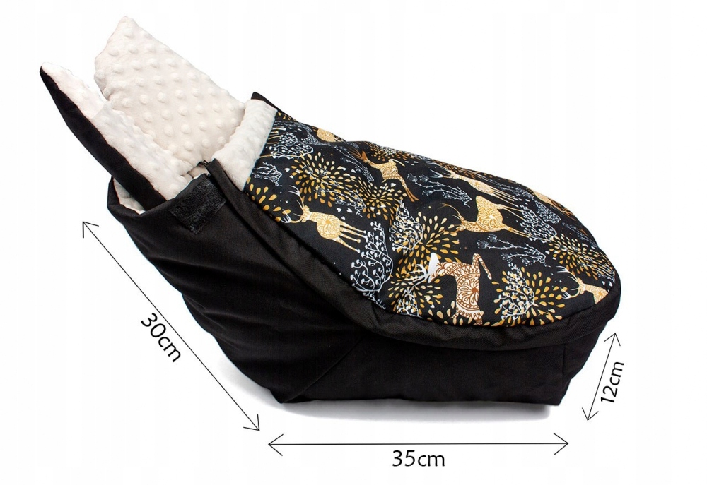 • Підходить для всіх люльок для немовлят, також п'ятиточкових, завдяки використанню спеціальних блискавок які дозволяють ідеально підлаштувати отвори для ременя відповідно до висоти ручок дитини. Відкривання блискавок в отворах дозволяє швидко вставляти та витягувати дитину, загорнуту в спальний мішок.