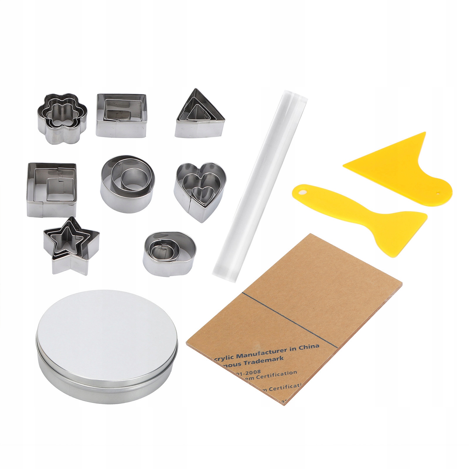 - 24 x глини для різання форми (трикутник 3 x, 3 x квіткова форма, 3 x квадрат, 3 x овал викладання, 3 x кут, 3 x частота серцебиття, 3 x круглий тіст) 1 x акрилова плата