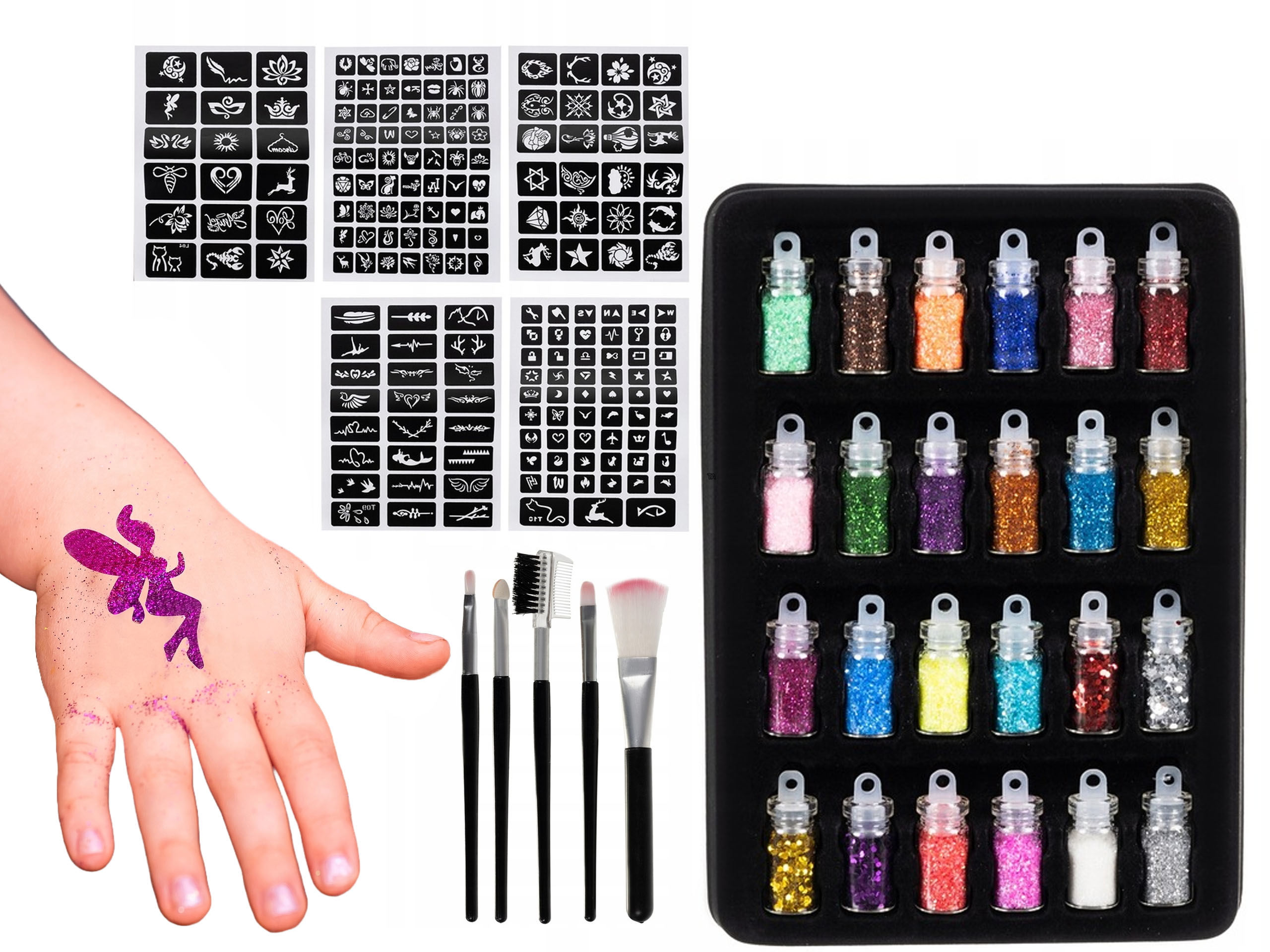 ГЛІТТЕР ТАТУ БАГАТО ШАБЛОНІВ + 12 КОЛЬОРІВ МАЛЕНЬКИЙ НАБІР ДЛЯ ДІТЕЙ