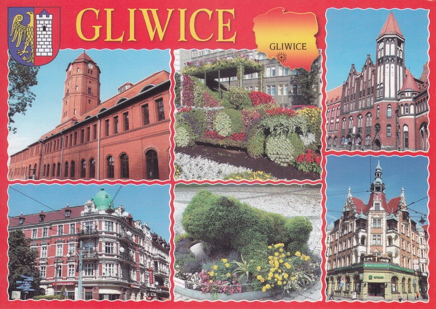 GLIWICE - SZKOŁA - UL. DWORCOWA - POCZTA - HOTEL DIAMENT - MAPKA - HERB